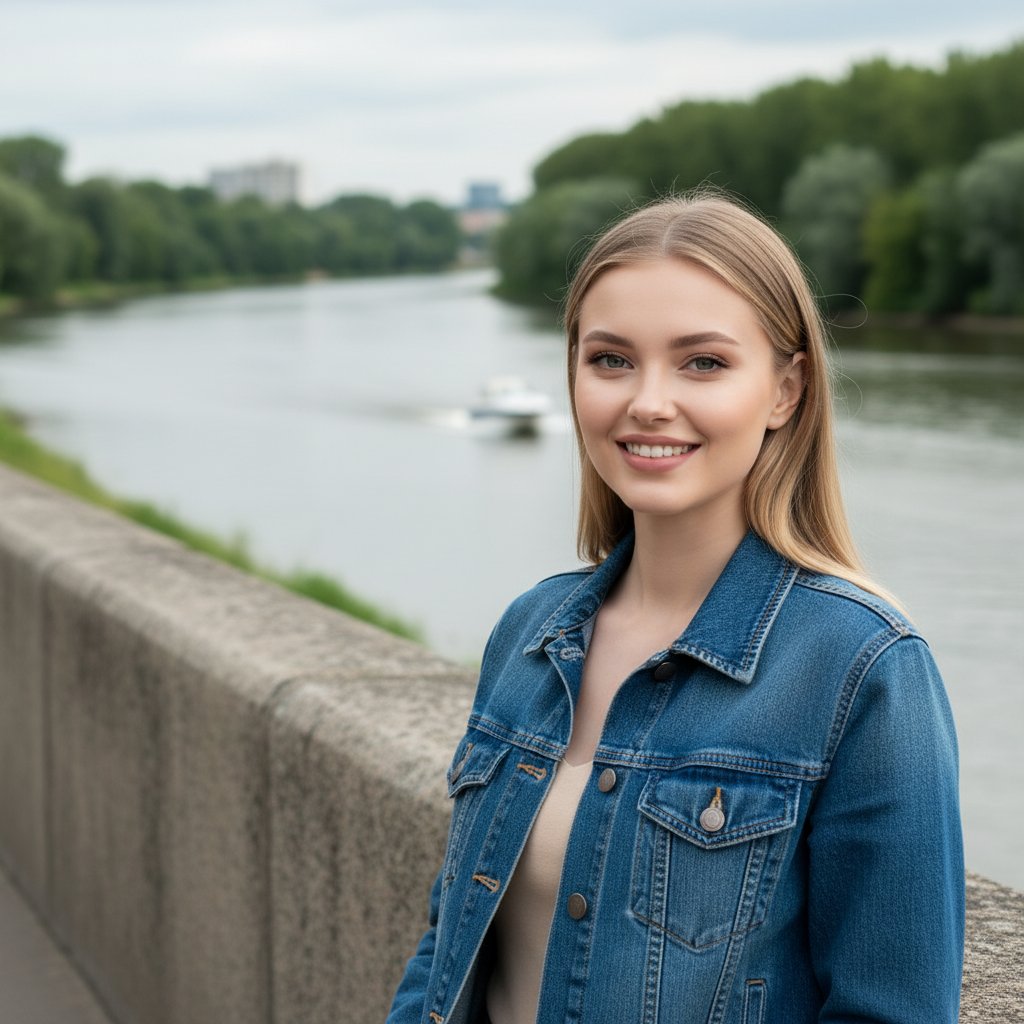Портрет юной девушки в джинсовой куртке, стоящей у бетонного ограждения набережной. Она смотрит в объектив с приветливой улыбкой. За ней виднеется река, деревья вдоль берега и проплывающий катер. Освещение — мягкий дневной свет, снято со среднего плана.