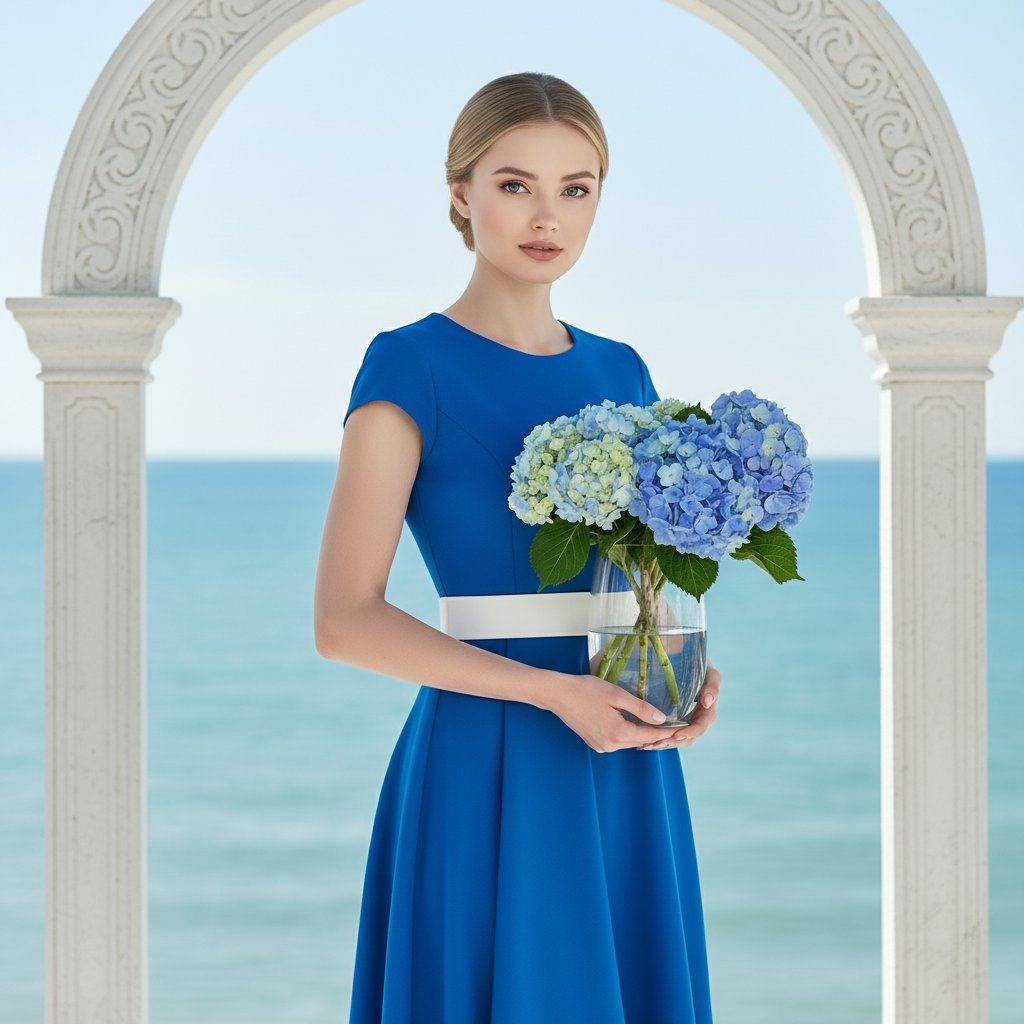 Портрет молодой женщины в элегантном голубом платье с белым поясом, снятый на среднем плане. Она стоит у белой арки, за которой открывается вид на море, и смотрит прямо в объектив. Ее волосы уложены в аккуратный низкий пучок. В руках она держит прозрачную стеклянную вазу, наполненную голубыми гортензиями. Поза девушки выглядит изящно и непринужденно.