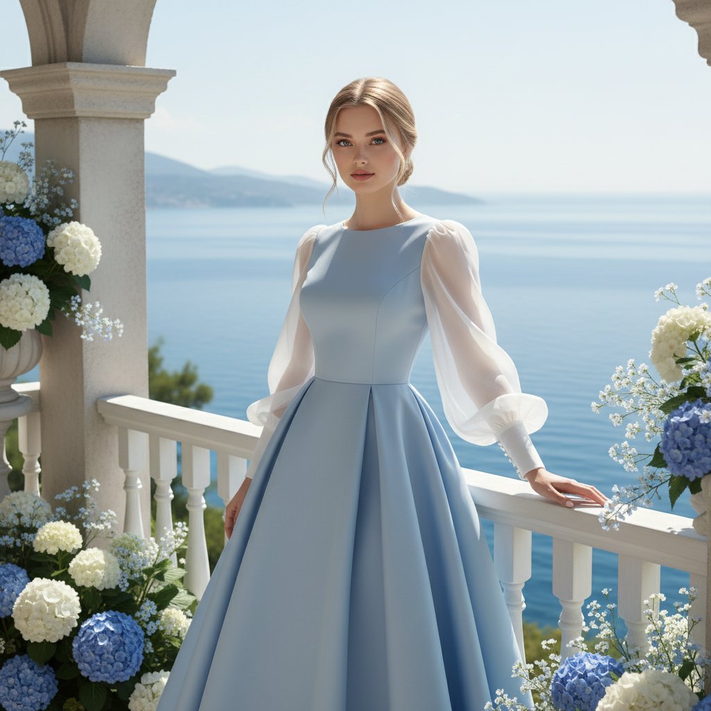 Женщина в элегантном голубом платье с пышной юбкой и длинными белыми рукавами, снятая по пояс, у арки с живописным видом на море. Она смотрит прямо в объектив. Волосы аккуратно собраны в пучок. Легко опирается на белые перила. Вокруг цветут бело-голубые цветы.