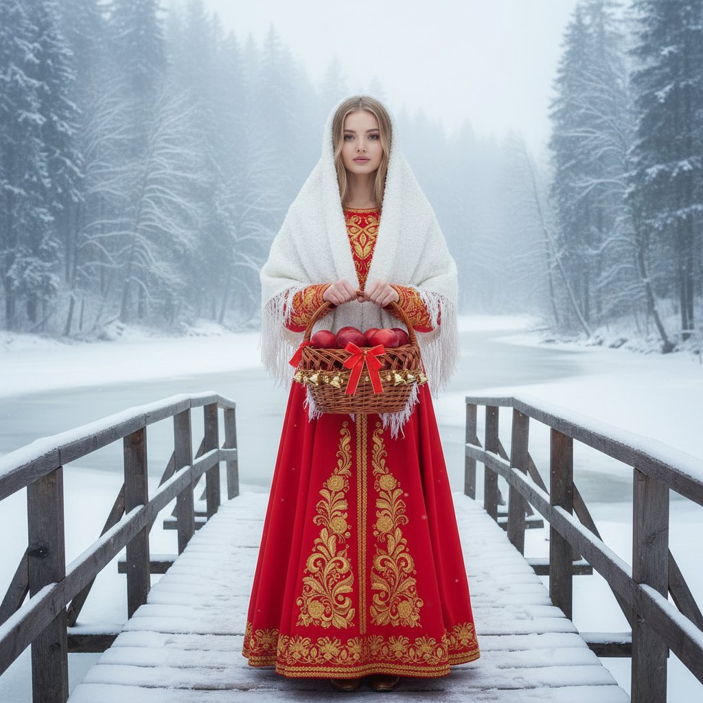 Юная особа в ярко-красном сарафане с золотыми узорами, укрытая пуховым платком, позирует на деревянном мосту над замерзшей рекой. В руках у нее украшенная корзина с яблоками, взгляд направлен в объектив. Вокруг виднеются покрытые снегом деревья, воздух окутан легкой дымкой.