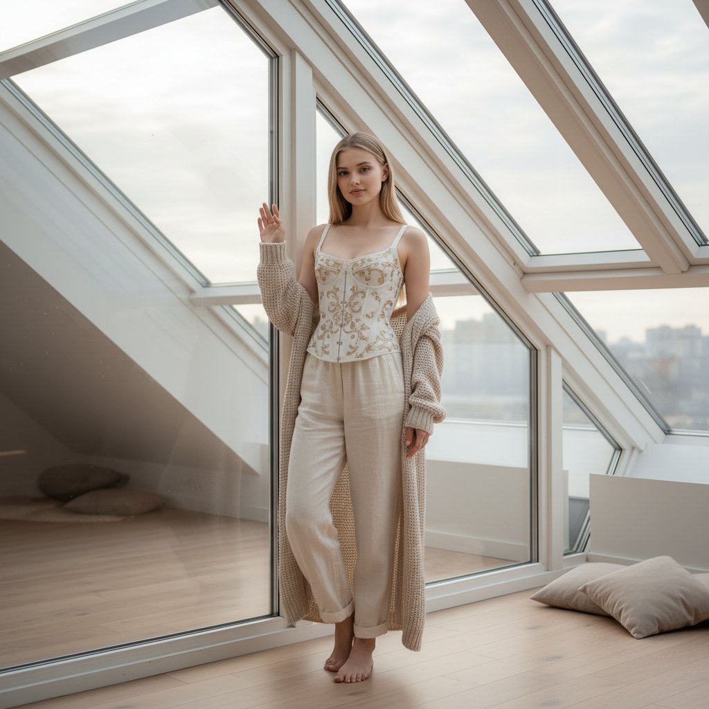 Молодая женщина в светлой мансарде с панорамными окнами. На ней белый корсет, украшенный золотым узором, свободные льняные брюки и длинный вязаный кардиган. Стоя босиком у окна, она касается стекла рукой и смотрит в объектив с легкой улыбкой. Комнату заливает мягкий, рассеянный свет.