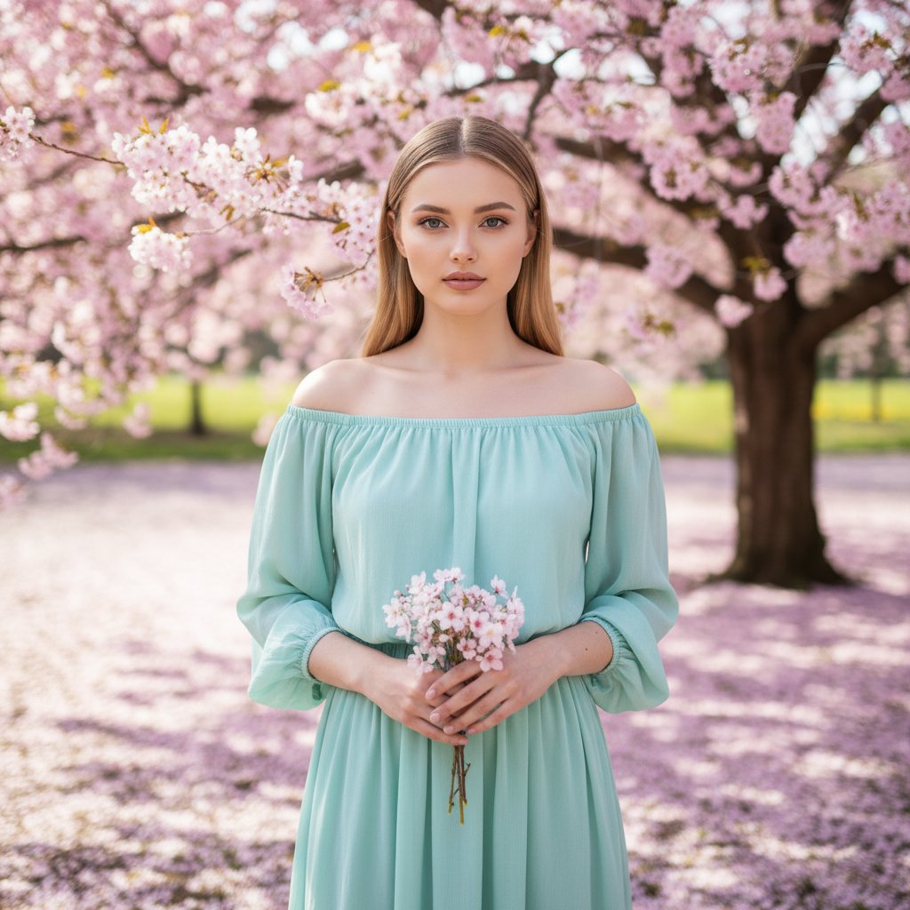 Портрет девушки в воздушном мятном платье с открытой линией плеч, стоящей на фоне цветущей сакуры. Ее взгляд устремлен в объектив, в руках она держит миниатюрный букет. За ней — земля, усыпанная розовыми лепестками сакуры. Мягкое естественное освещение подчеркивает ее нежность и изящество.