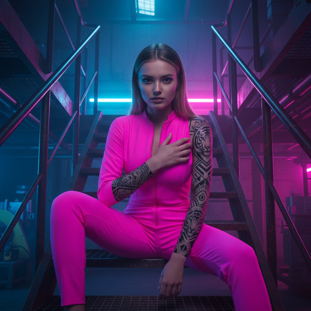 Девушка в ярко-розовом неоновом комбинезоне расположилась на металлической лестнице в индустриальной обстановке. Она прижимает руку к груди, демонстрируя выразительную татуировку тигра, покрывающую её предплечье и плечо. Резкое освещение с неоновыми отблесками создает сильные контрасты.