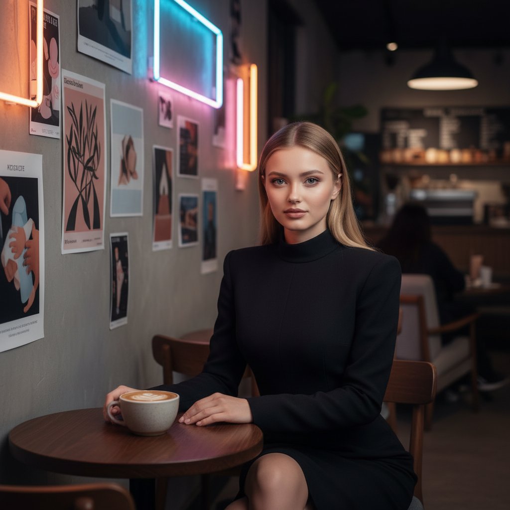 Элегантная женщина в строгом черном платье расположилась за столиком у стены, декорированной постерами и неоновой подсветкой. На столе стоит чашка кофе флэт уайт. Она смотрит в объектив с безмятежным выражением лица, в то время как вокруг царит приглушенная атмосфера и стильный дизайн кофейни.