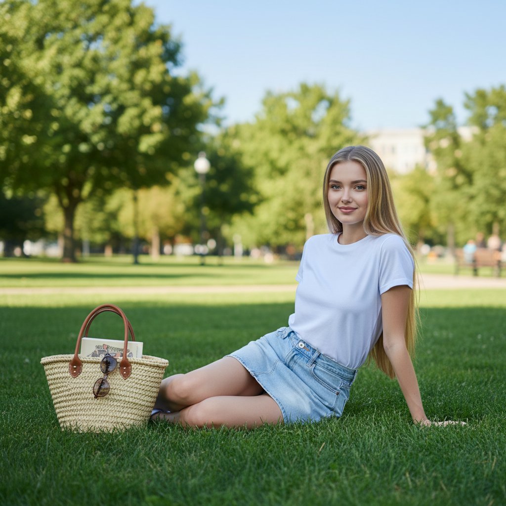 Молодая женщина в джинсовой мини-юбке и белой футболке расположилась на изумрудной траве в городском парке. Одна рука опирается на землю, взгляд направлен в объектив, на лице — безмятежная улыбка. Её волосы свободно ниспадают, а рядом — плетеная сумка. Снято со среднего расстояния, передавая атмосферу солнечного летнего дня.