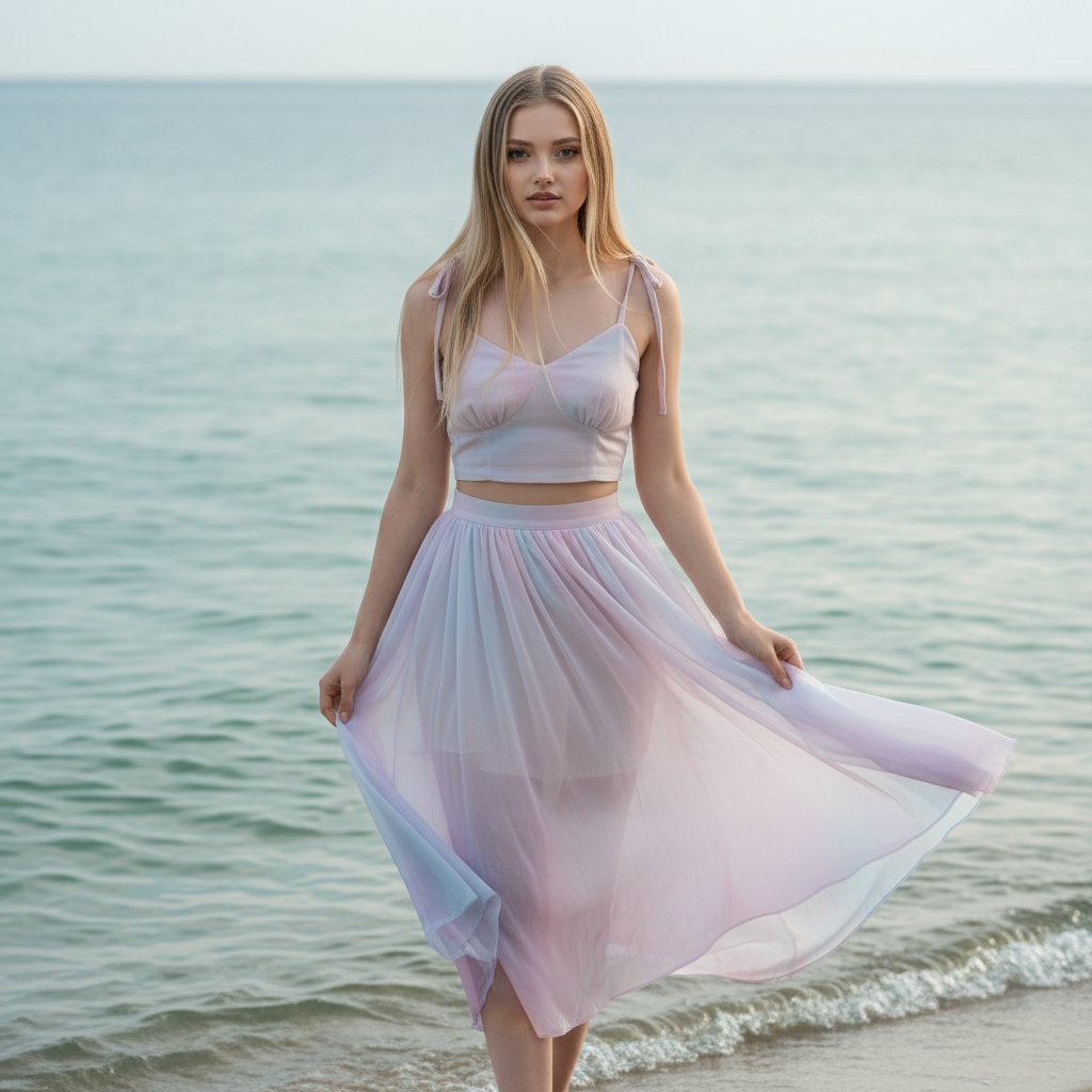 Женщина у кромки воды, одетая в струящуюся прозрачную юбку пастельных тонов и короткий топ с завязками на плечах. Одна рука нежно касается подола юбки, другая расслабленно опущена вдоль тела. Взгляд направлен прямо в объектив. На заднем плане — переливающееся море. Снято со среднего ракурса.