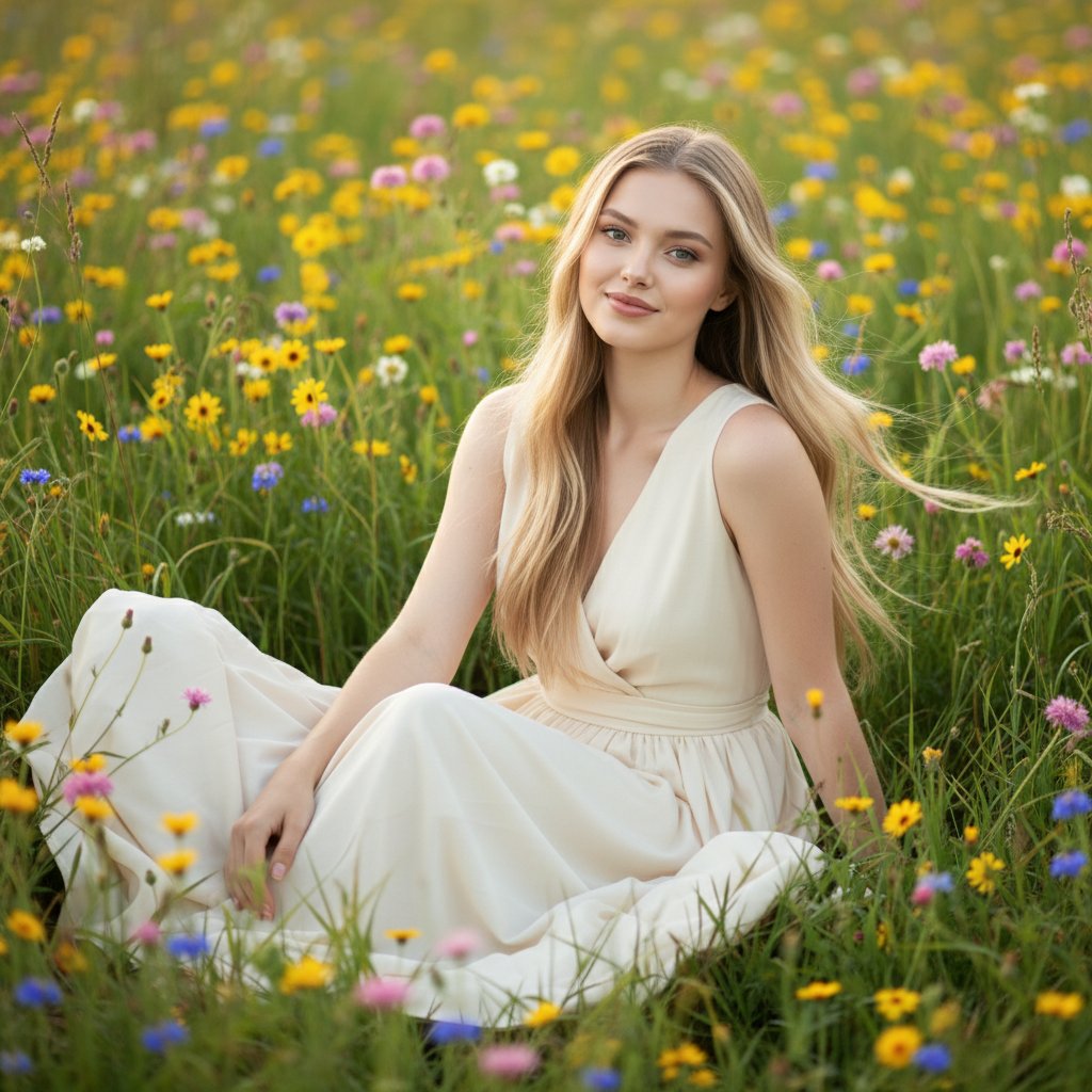 Молодая особа в струящемся кремовом наряде расположилась на лугу, утопающем в полевых цветах. Она смотрит прямо в объектив, её лицо озаряет лёгкая, непринуждённая улыбка. Вокруг виднеются разноцветные бутоны и сочная зелень травы. Нежный ветерок колышет её волосы и платье, создавая атмосферу умиротворённого летнего дня.