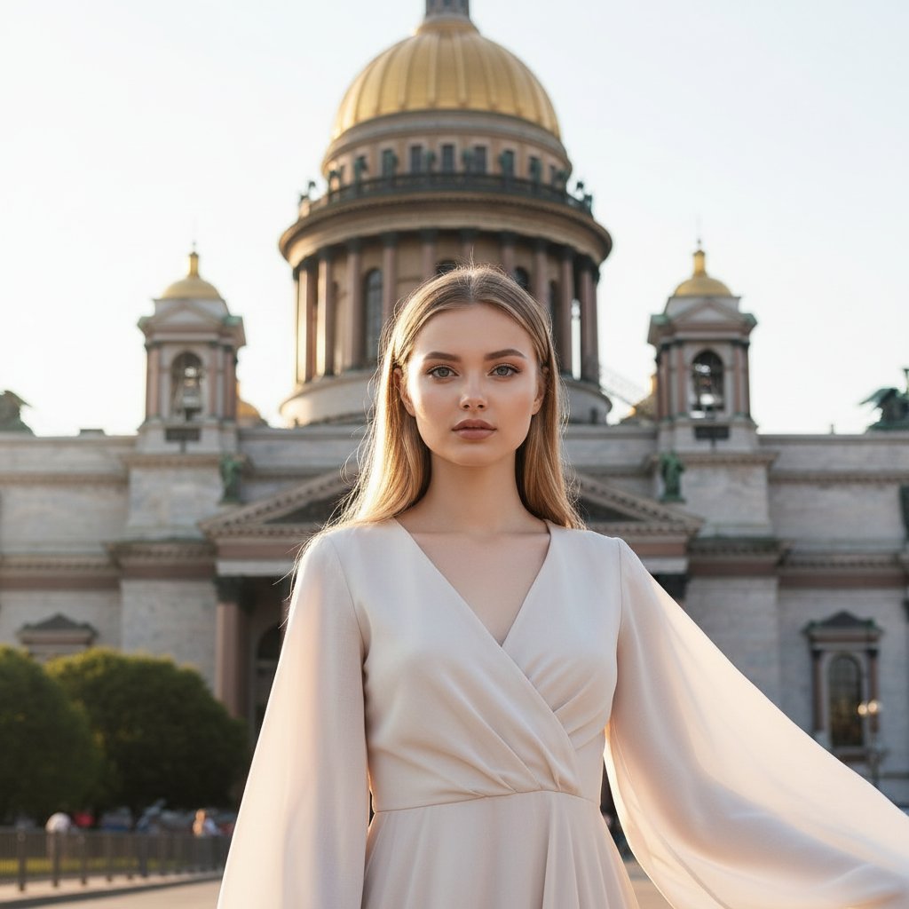 Портрет девушки в легком, струящемся платье, стоящей на фоне Исаакиевского собора в Санкт-Петербурге. Платье элегантно облегает ее фигуру. Крупный план, взгляд девушки уверенный и спокойный, направлен прямо в объектив. Позади нее возвышается величественный собор с сияющим золотым куполом и массивными колоннами, детали архитектуры контрастируют с ее нарядом. Мягкое освещение создает уютную атмосферу, а солнечные лучи, падающие на ее волосы, придают им сияние.