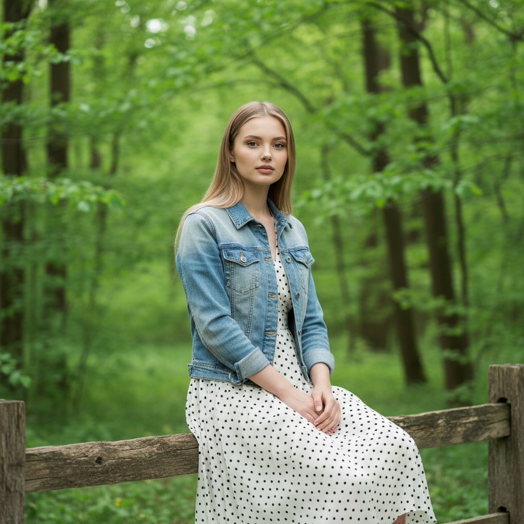 Молодая женщина в струящемся молочном платье в горошек, поверх накинута джинсовая куртка. Она сидит на деревянном заборе в окружении зелёной рощи. Руки спокойно лежат на коленях, взгляд направлен прямо в объектив. Весеннее рассеянное освещение создаёт нежную и воздушную атмосферу.