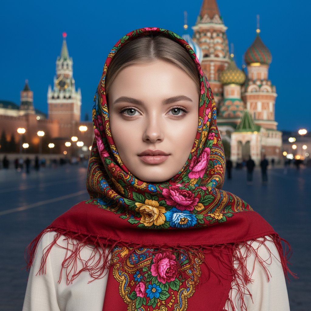 Молодая женщина в русском народном платке позирует на фоне вечерней Красной площади, взгляд направлен в объектив.