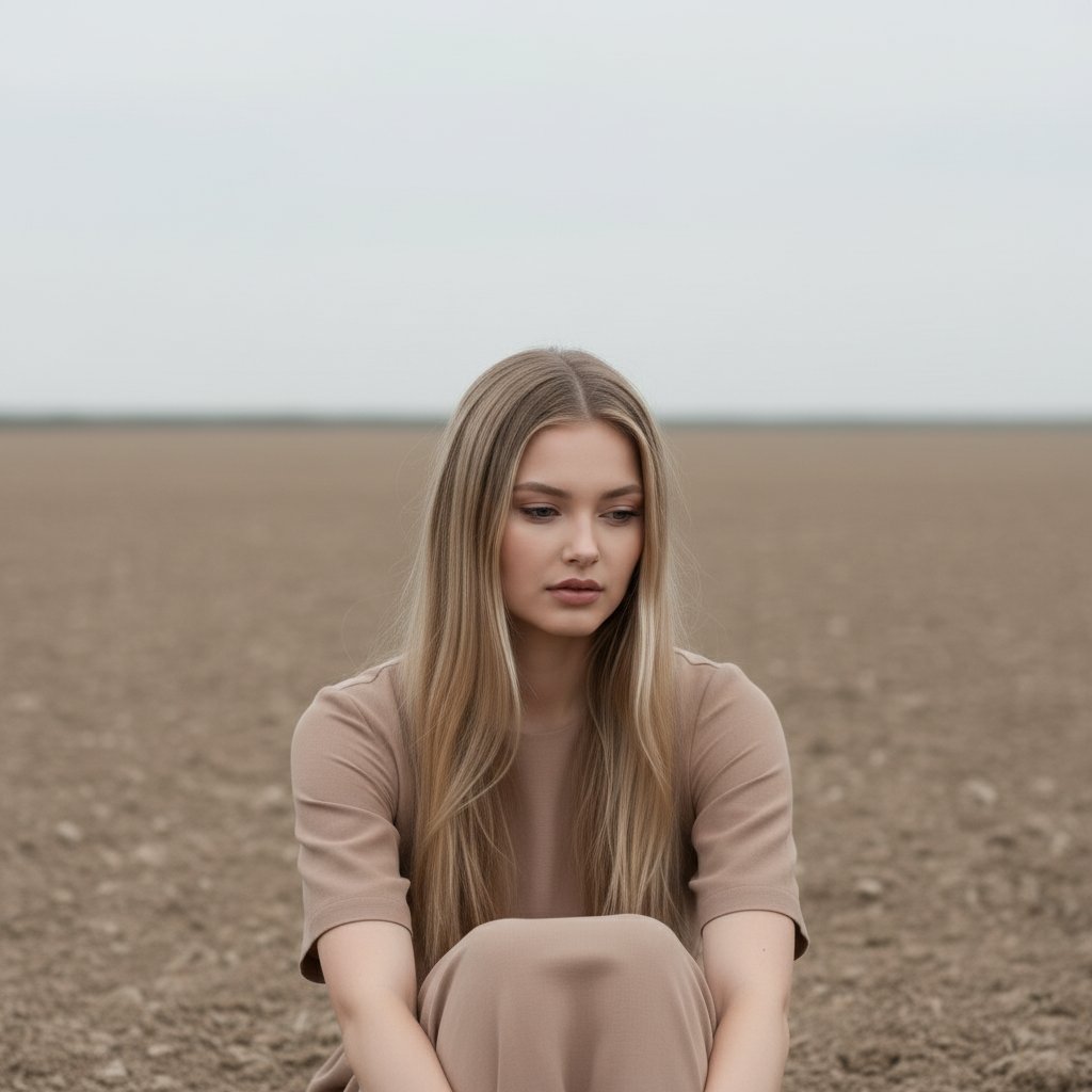 Одинокая девушка в простом светло-коричневом платье расположилась на бескрайнем поле. Её взгляд направлен вниз, создавая атмосферу умиротворения. Пустое пространство вокруг, где земля и небо сливаются в единой цветовой гамме, подчеркивает минималистичную композицию. Снято крупным планом.