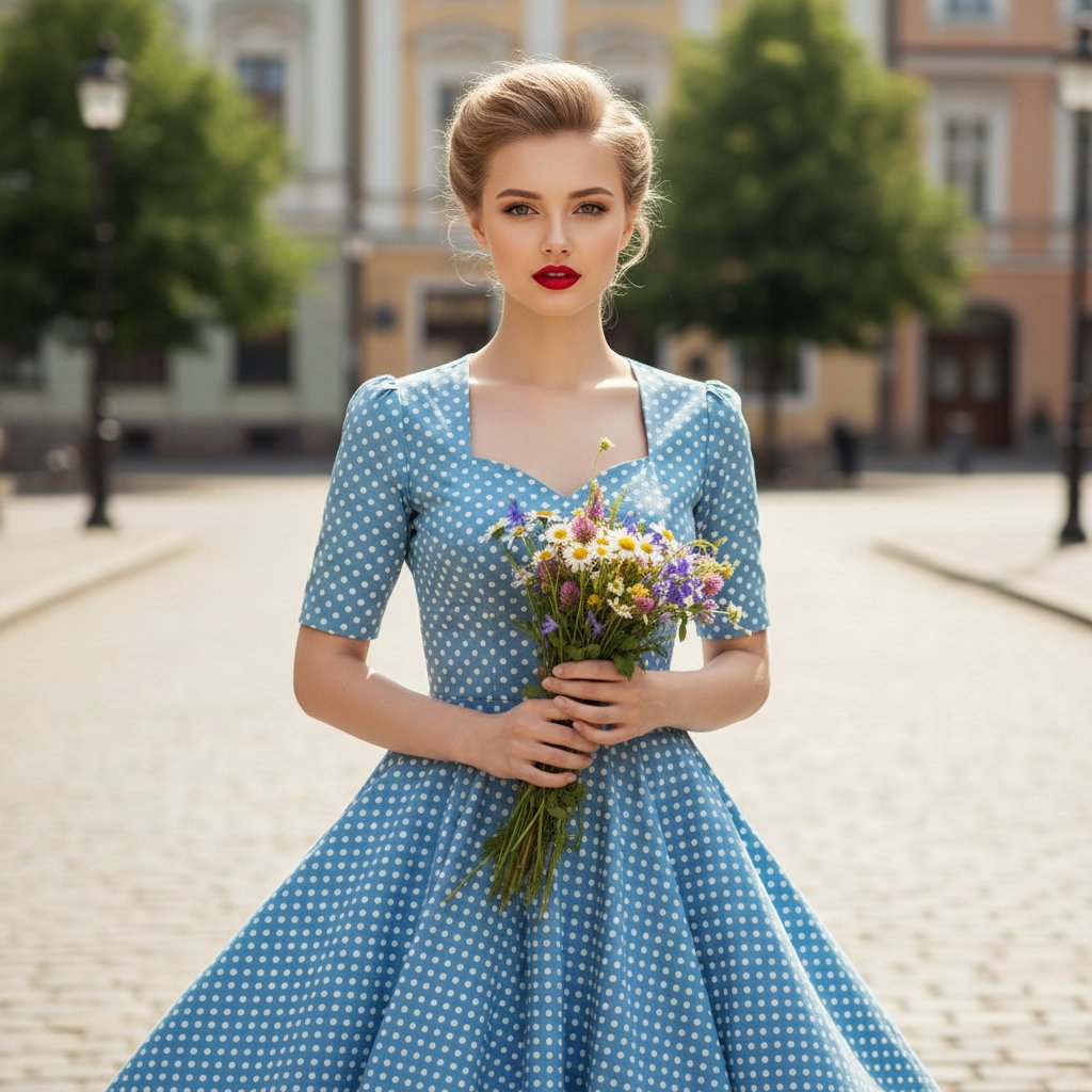 Фотография молодой женщины в стилизованном под 1940-е годы голубом платье в белый горошек. Наряд с короткими рукавами и расклешенной юбкой. Волосы уложены в высокую прическу, акцент на ярко-красной помаде. Женщина стоит на улице, в руках у нее скромный букет полевых цветов.