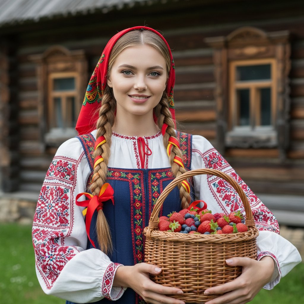 Юная особа в народном русском костюме, украшенном вышивкой, и красном платке. Волосы заплетены в косы с лентами. В руках у нее корзина, полная спелых ягод. Девушка стоит перед бревенчатым домом, ее лицо освещено, она улыбается в камеру. Особое внимание уделено чертам лица и деталям одежды.