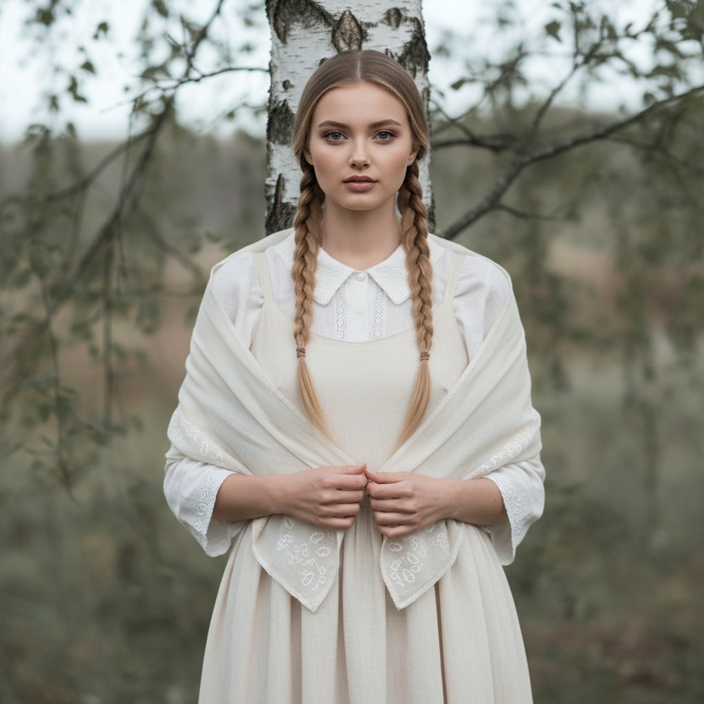 Молодая женщина в длинной белой рубахе и светлом сарафане с деликатной вышивкой, волосы заплетены в две косы. На плечах легкая шаль, которую она держит обеими руками. Стоит спиной к березе, взгляд направлен в объектив. Мягкое, рассеянное освещение, минималистичная композиция, подчеркивающая традиционный образ.