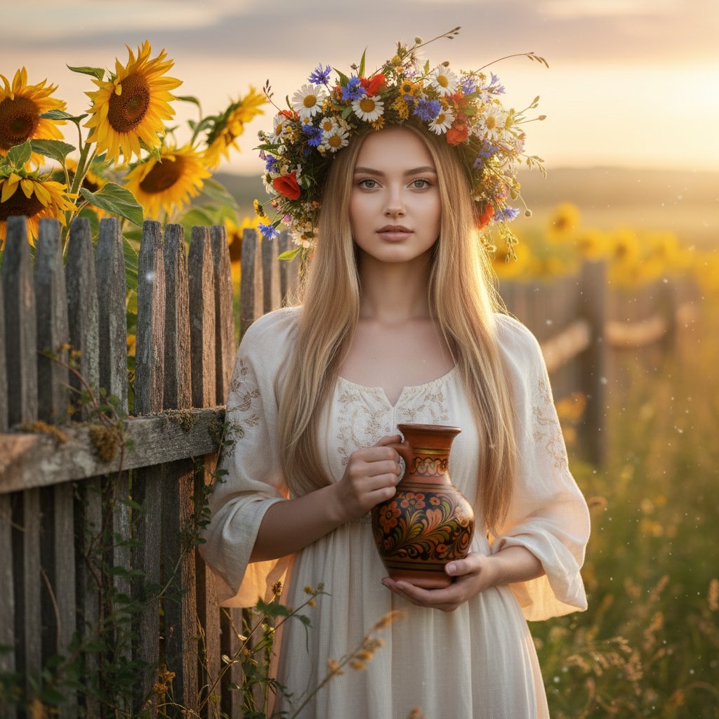Молодая женщина в легком кремовом платье и венке из полевых цветов стоит у старинного деревянного забора, утопающего в золоте цветущих подсолнухов. В руках она держит расписной глиняный сосуд. Ее взгляд направлен прямо в объектив. Вокруг разливается тепло летнего солнечного вечера, создавая атмосферу волшебной русской сказки.