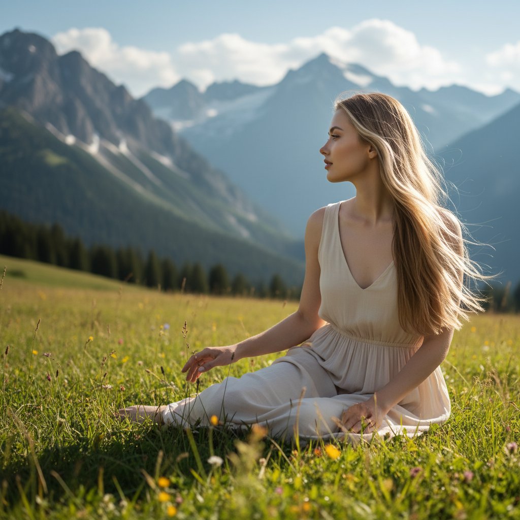 Фотография: молодая женщина в легком летнем платье расположилась на лугу в горах. Её пальцы легко касаются травинок, пока взгляд устремлен вдаль. Легкий ветерок играет с ее волосами. На заднем плане возвышаются величественные горные пики. Снято крупным планом, подчеркивая спокойствие и единение с природой.