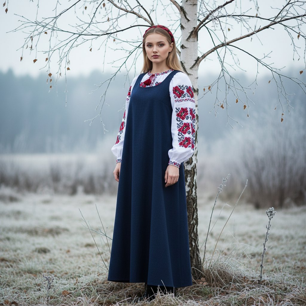 Молодая женщина в белой вышитой рубахе и длинном темном сарафане, с лентой в волосах, стоит у березы, прислонившись к стволу, взгляд направлен в камеру. Минималистичная композиция, легкий иней на ветвях, ранняя зима.