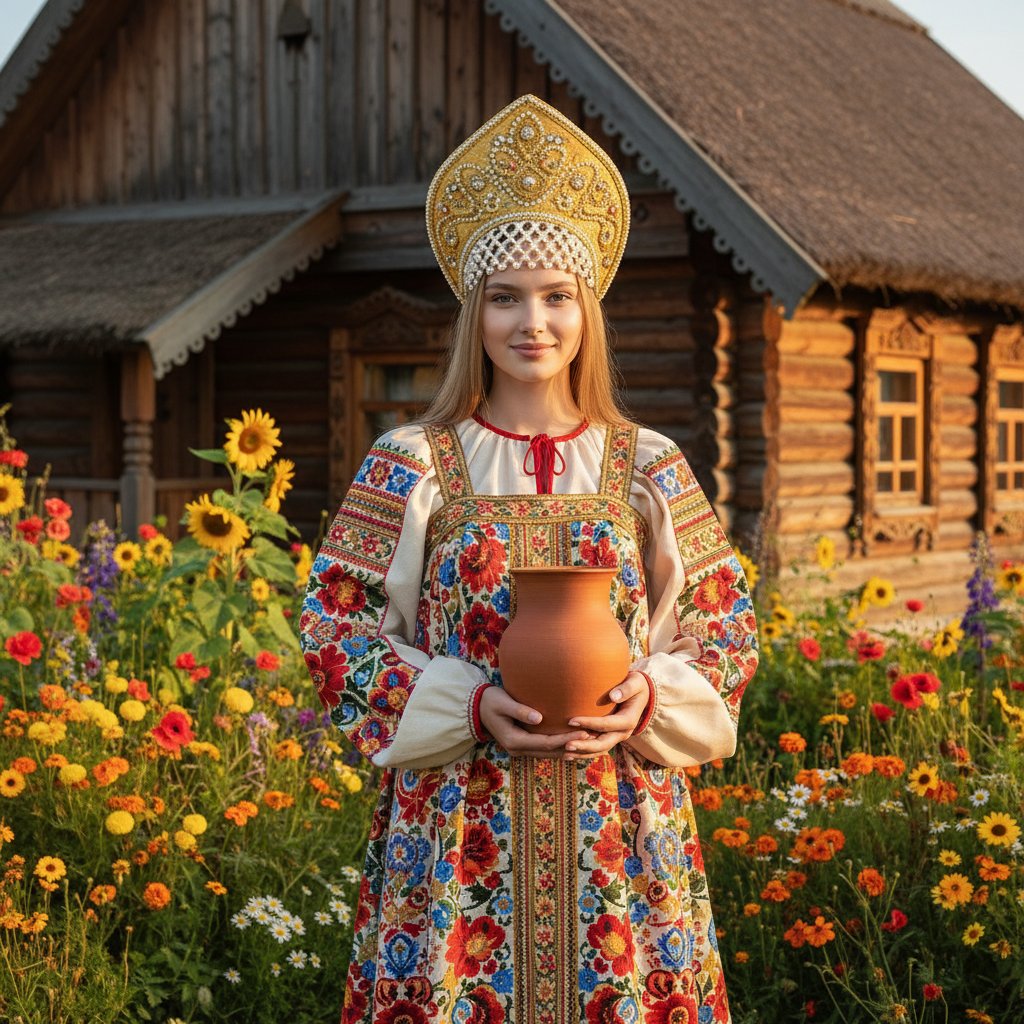Молодая женщина в красочном русском сарафане и головном уборе кокошник позирует на фоне деревянной избы, окруженной пышными цветами. Она держит в руках глиняный кувшин и смотрит в объектив с легкой улыбкой. Солнечный свет подчеркивает детали ее наряда и лица.