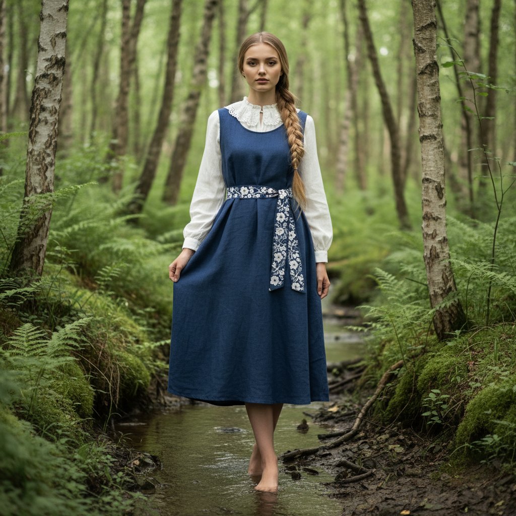 Портрет девушки в летнем сарафане глубокого синего цвета, украшенном вышивкой на поясе, под ним — белая блузка с кружевным воротником. Волосы аккуратно заплетены в косу. Она стоит босиком на берегу лесного ручья, среди берёз. Одной рукой придерживает край сарафана, взгляд направлен прямо в объектив. Стиль — минимализм, освещение — пасмурный день.