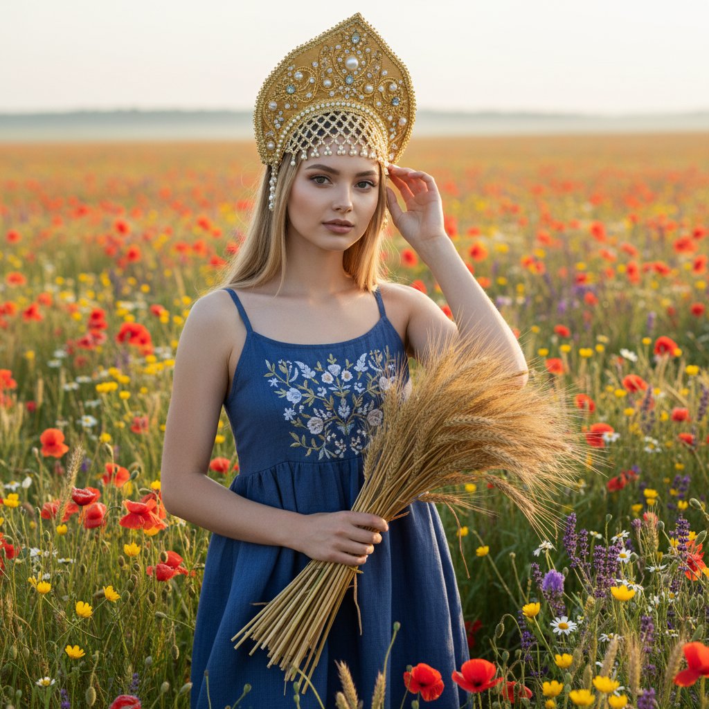 Молодая женщина в синем сарафане и золотом кокошнике на поле с цветами. Держит сноп пшеницы, поправляет головной убор и смотрит прямо. Средний план, летнее утро, мягкий рассветный свет.