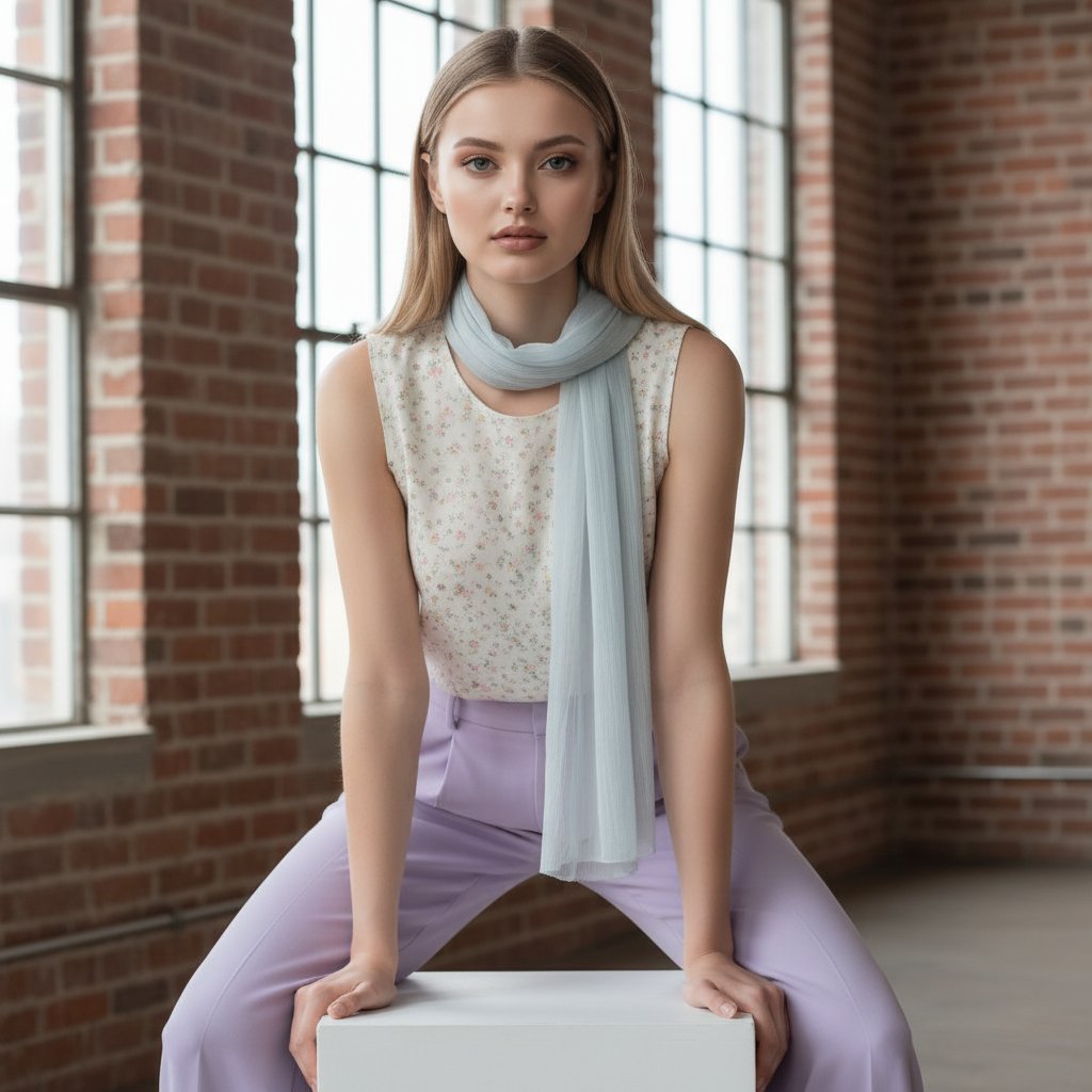 Модель в студии с кирпичной кладкой и крупными окнами, одета в светлый топ с цветочным узором, широкие брюки цвета лаванды и легкий шарф на шее. Она находится в низкой позе, опираясь на подиум руками, и смотрит в объектив. Мягкое естественное освещение.