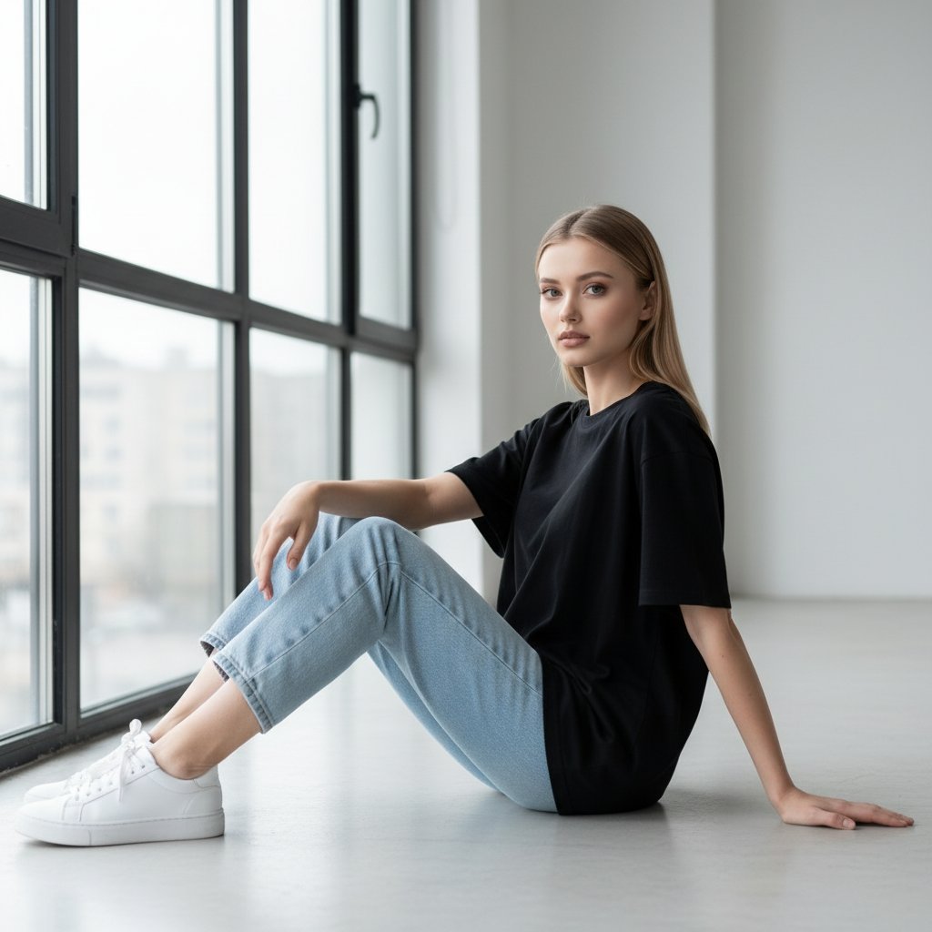 Молодая женщина в светло-голубых джинсах прямого кроя и черной футболке оверсайз, на ногах – белые кеды. Она сидит на полу, боком к зрителю, у массивного окна в студийном пространстве. Одна рука покоится на колене, другая служит опорой позади. Корпус развернут к камере, взгляд направлен прямо в объектив. Снято крупным планом на фоне минималистичного светлого интерьера.