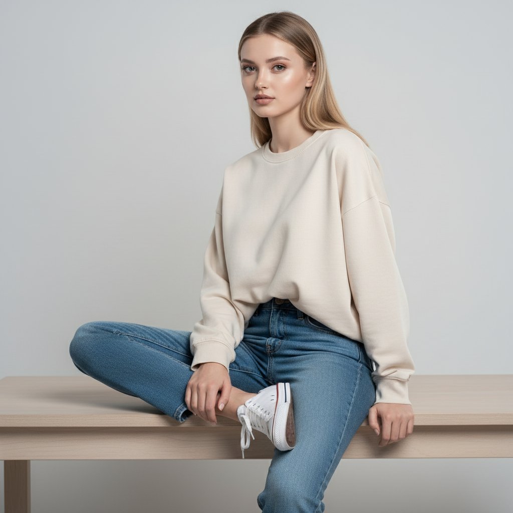 Молодая женщина в синих джинсах прямого кроя с высокой посадкой и светлом объемном свитшоте. На ногах – простые белые кеды. Она сидит вполоборота на краю светлого деревянного стола, руки расслабленно свисают, ноги скрещены. Взгляд уверенный, направлен в объектив. Съемка крупным планом в условиях студийного минимализма.