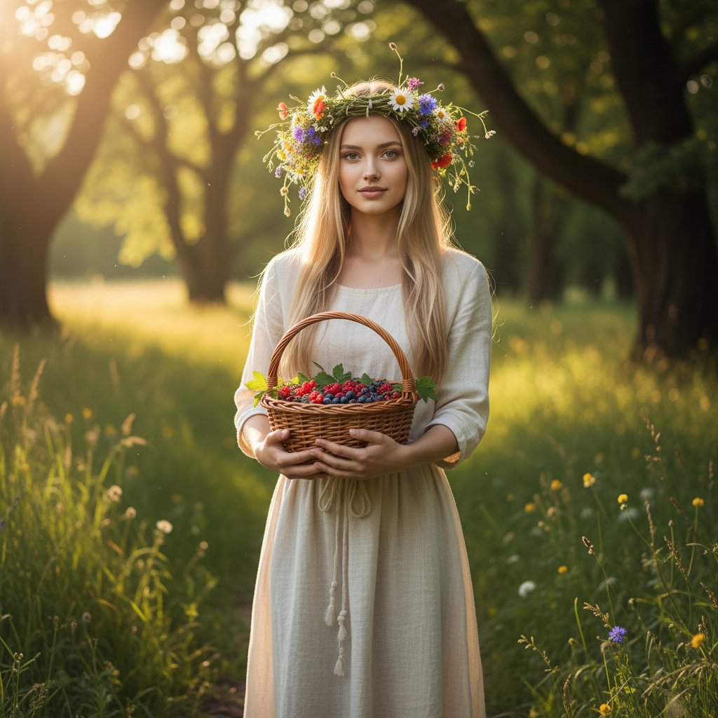 Юная особа в простом льняном платье и венке из полевых цветов позирует на лесной опушке. В руках она держит плетеную корзинку, наполненную лесными ягодами. Ее взгляд направлен прямо на зрителя. Солнечные лучи пробиваются сквозь листву, создавая волшебное, летнее настроение.