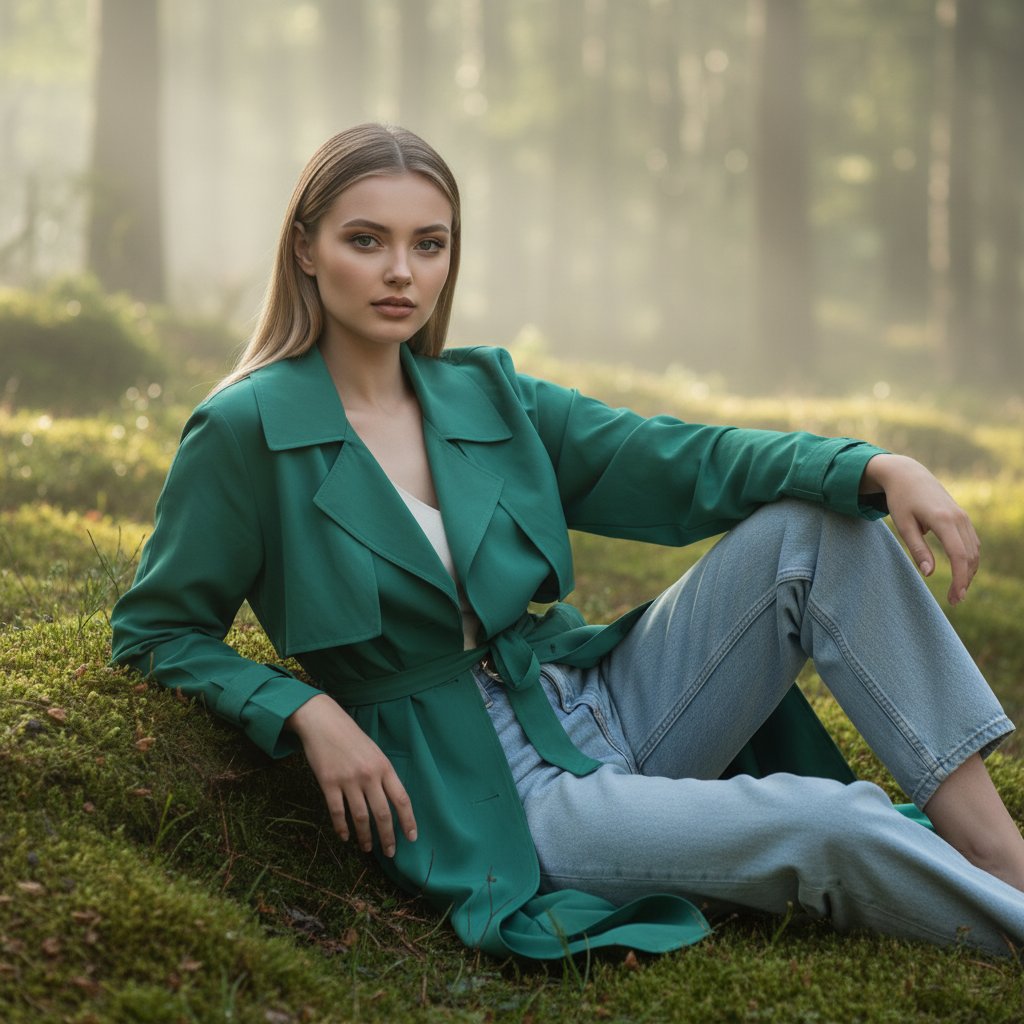 Портрет девушки в струящемся зелёном плаще и светлых джинсах, расслабленно полулежащей на лесной поляне, покрытой мхом. Одна рука опирается о землю, другая покоится на колене. Взгляд уверенный, направлен в камеру. Атмосфера утренней дымки и свежести леса.