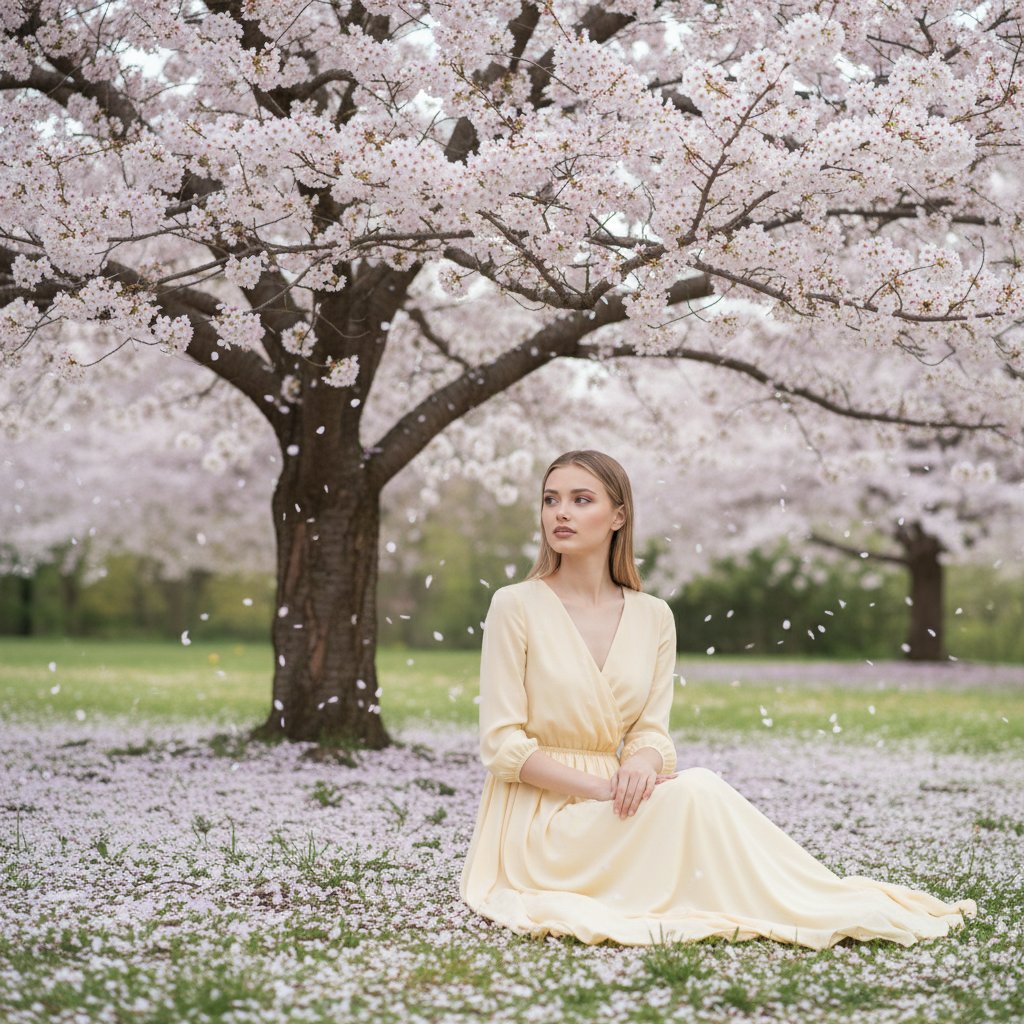 Изображение девушки в нежно-жёлтом наряде, сидящей под цветущим вишнёвым деревом. Руки покоятся на коленях, взгляд устремлён в сторону. Вокруг видны опавшие лепестки, устилающие землю. Мягкий свет подчёркивает безмятежность и весеннюю атмосферу.