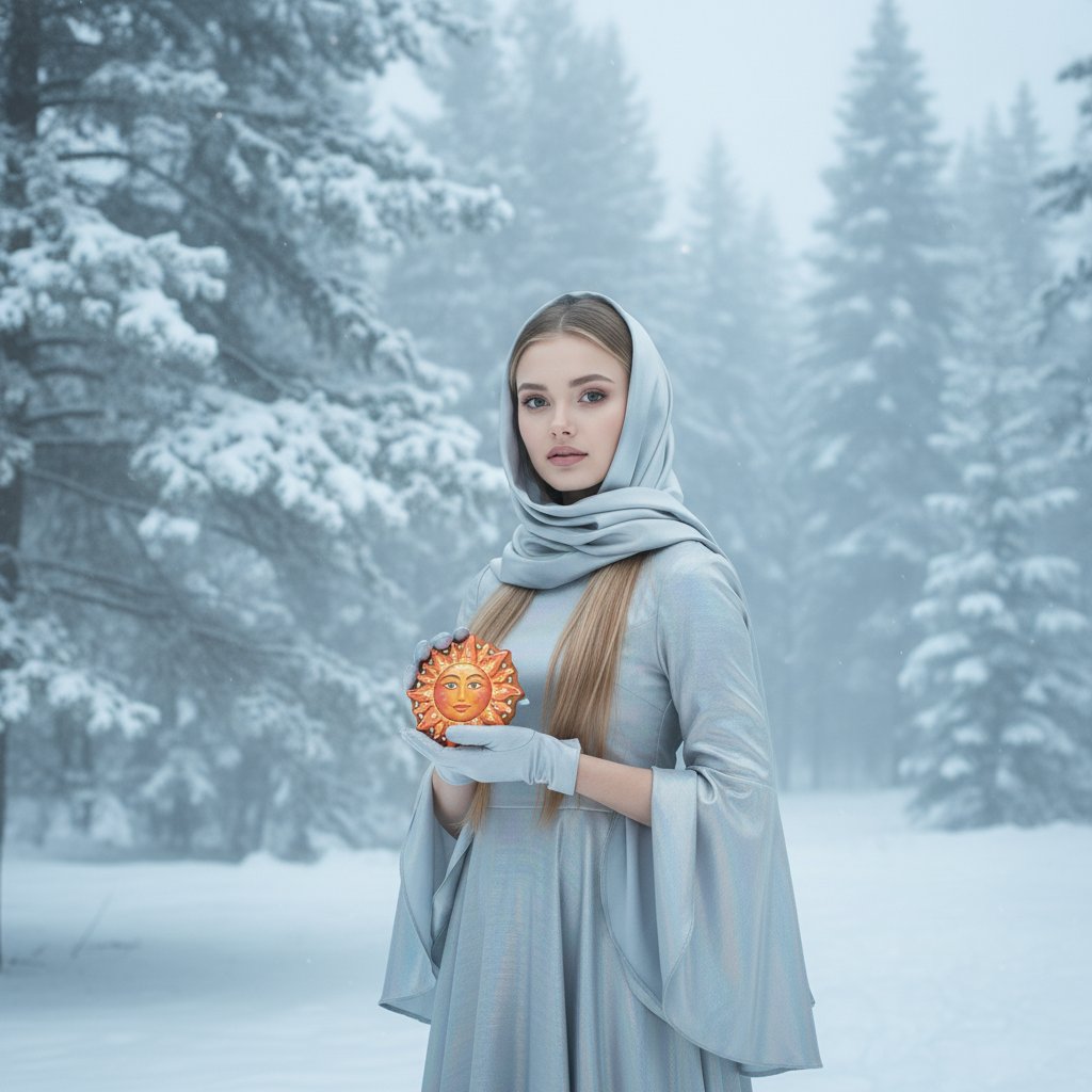 Молодая женщина в переливающемся серебристом платье с расклешенными рукавами и шелковом платке на голове позирует среди величественных сосен, покрытых снегом. В руках она держит расписной пряник в виде солнца, взгляд направлен в объектив. Легкая дымка морозного тумана окутывает сцену.