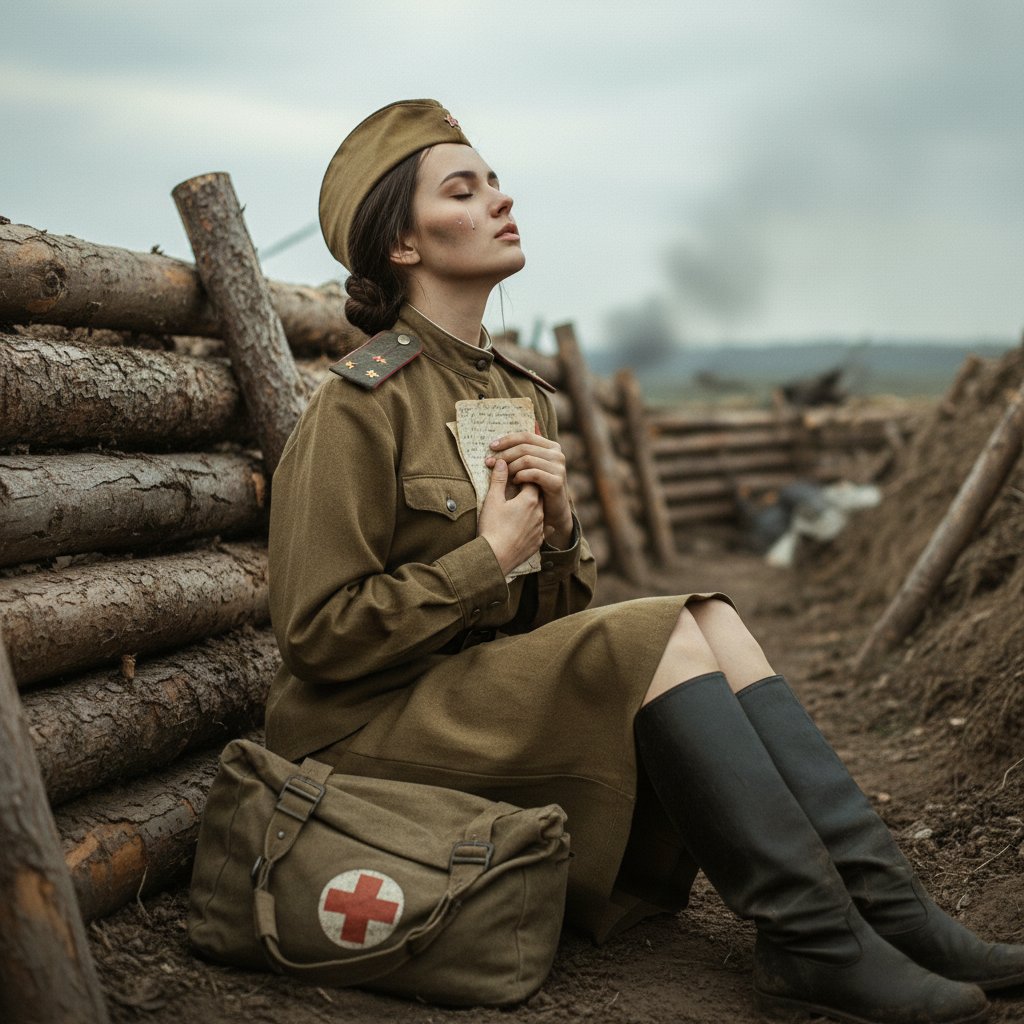 Создай крупный портрет, не меняя черты лица. Кинематографический эффект с добавлением зерна. близкий кадр Качество 8К Формат 9:16 Девушка сидит на земле на поле боя , уперлась спиной к бревнам или к земле(в окопе) . Она сжимает руками письмо состаренное , и прижимает его к груди , она запрокинула голову и закрыла глаза. По щеке стекает слеза Одета в советскую военную форму: гимнастерка, юбка, и сапоги высокие, пилотка, и большая сумка медсестры с плюсом красным Волосы собраны в низкий пучек Безупречный макияж. На лице капли грязи(немного) Освещение дневное но пасмурное Фон размыт