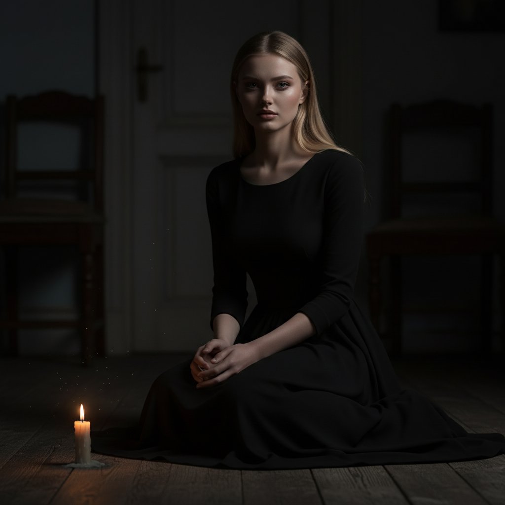 Женщина в простом чёрном наряде на полу в полумраке. Единственный источник света — тусклое пламя свечи неподалеку. Свет неравномерно освещает её лицо и руки, формируя контраст света и тени. Точечное освещение усиливает эмоциональное напряжение.