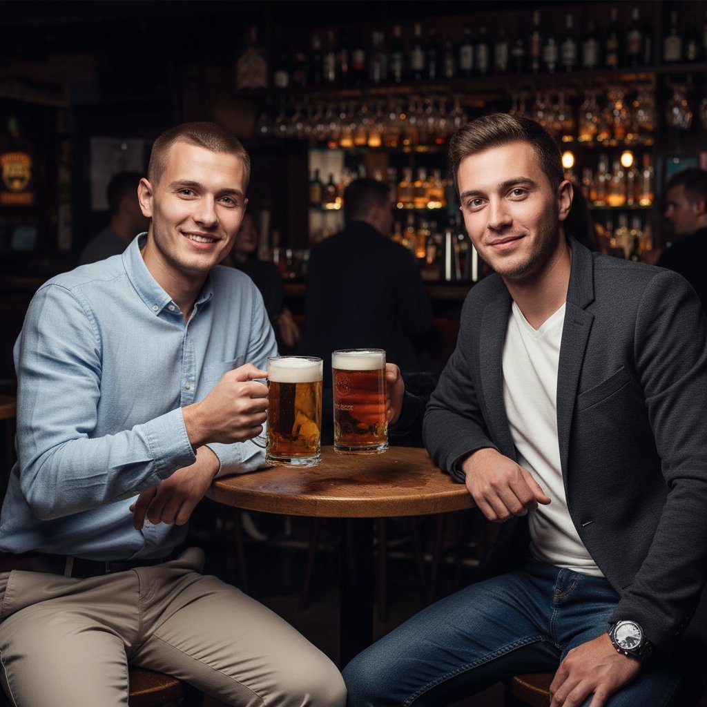 Двое парней сидят за столиком в баре, держа в руках пивные кружки. Они оба смотрят в объектив, улыбаясь. Один одет в голубую льняную рубашку и светло-бежевые брюки, другой — в серый пиджак, белую футболку и темные джинсы, на руке у него стильные часы.