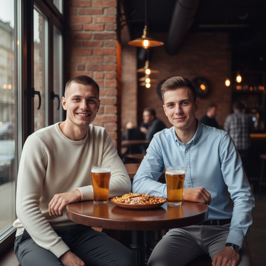 Двое молодых мужчин примерно одного возраста расположились за круглым деревянным столиком у окна в стильном баре. Оба смотрят в объектив с улыбками. Один одет в светлый свитер и темные брюки, другой – в рубашку нежно-голубого оттенка и серые брюки. Перед ними стоят бокалы с янтарным пивом, на столе также видна тарелка с закусками. Общая атмосфера – легкая и расслабленная, фон – интерьер бара с элементами кирпичной кладки.