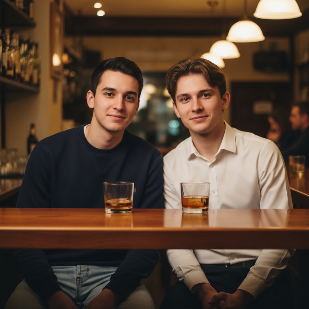 Два молодых парня расположились у барной стойки в тёплой атмосфере. Они смотрят прямо в объектив, на их лицах лёгкие улыбки. Один одет в темно-синий свитшот и светлые джинсы, другой — в белую рубашку и темные брюки. Перед ними на столе стоят бокалы с напитком янтарного цвета, освещение мягкое и приглушённое.