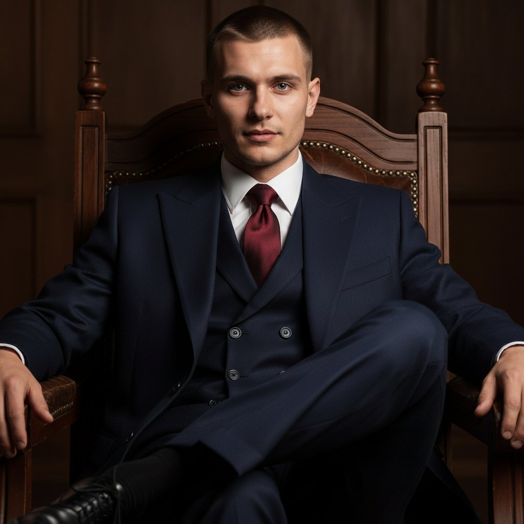 Мужчина в элегантном темно-синем костюме в стиле гангстеров 1920-х: острый двубортный пиджак, жилет, белоснежная накрахмаленная рубашка, бордовый шелковый галстук. Он сидит, закинув ногу на ногу, на внушительном деревянном стуле, опираясь локтем на спинку. Крупный план, взгляд прямо в объектив, уверенный вид.