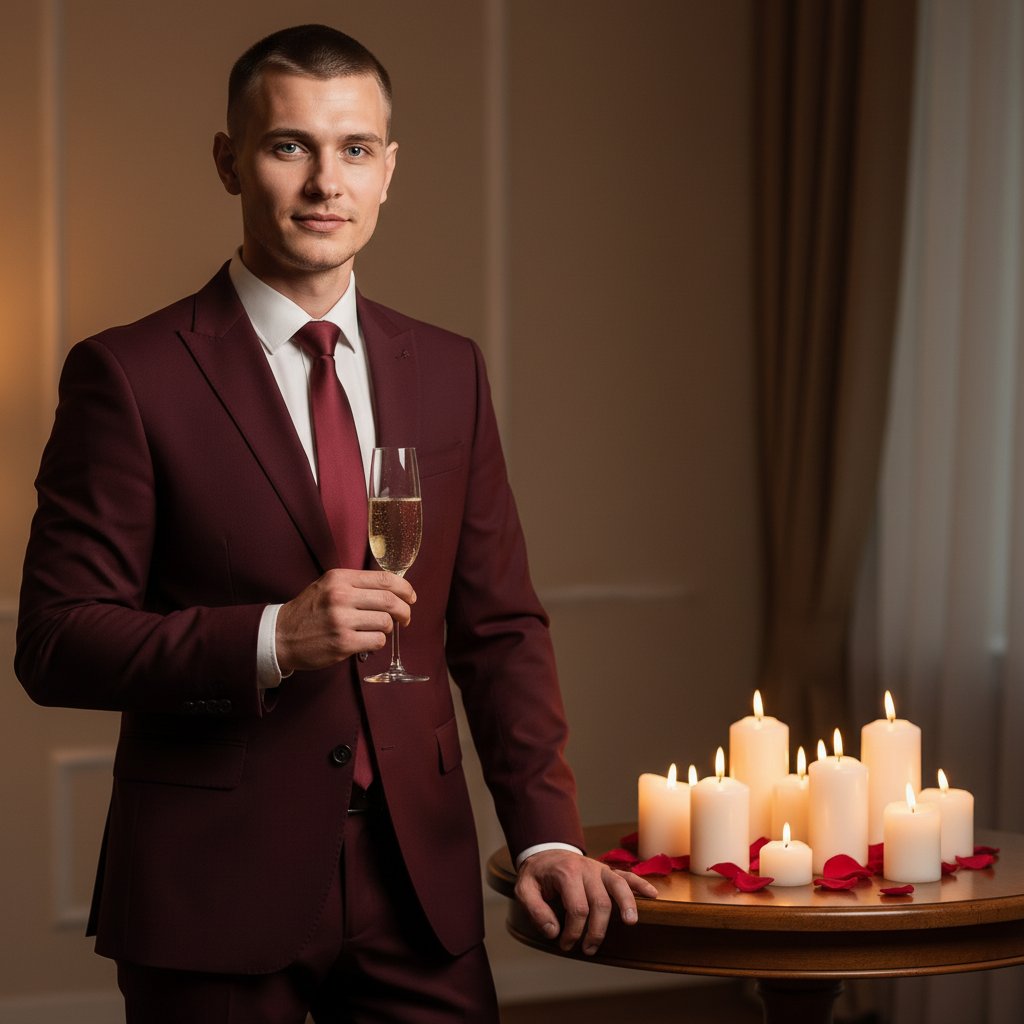 Элегантный мужчина в бордовом костюме и белой рубашке позирует у стола, декорированного свечами и лепестками роз. В руке он держит бокал игристого вина, а его взгляд, устремленный в объектив, сопровождает легкая улыбка. Мягкое освещение подчеркивает романтическую атмосферу.