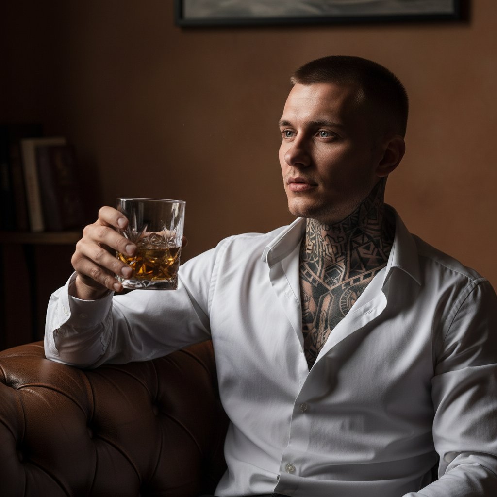 Мужчина в расстёгнутой белой рубашке, демонстрирующий татуировки на груди и шее, располагается на кожаном диване. В руке он держит бокал с виски и задумчиво смотрит в сторону. Приглушённое, таинственное освещение.