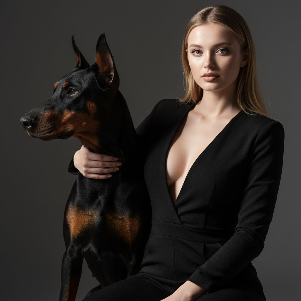 Женщина в стильном черном комбинезоне с выразительным декольте обнимает добермана. Крупный план ее лица, взгляд уверенный и прямой в объектив. Доберман повернул голову вбок, подчеркивая свои четкие черты. Драматическое освещение создает сильный контраст между фигурами.