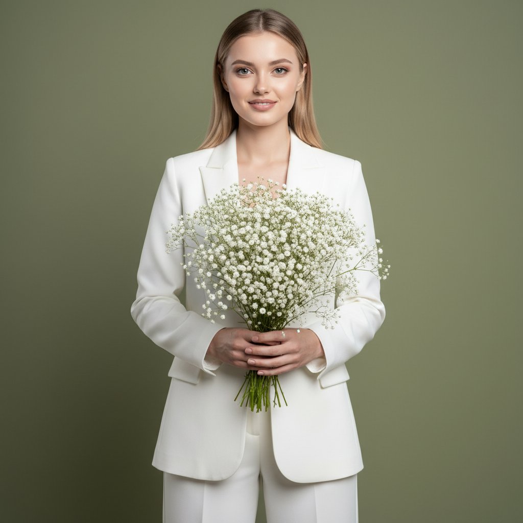 Передняя часть, средний план. Женщина в элегантном белом брючном костюме стоит на фоне мягкого оливково-зеленого оттенка. Она держит в руках пышный букет из мелких белых цветов, напоминающих гипсофилу. Ее взгляд направлен прямо в объектив, на лице легкая, безмятежная улыбка. Руки мягко сжимают стебли цветов.