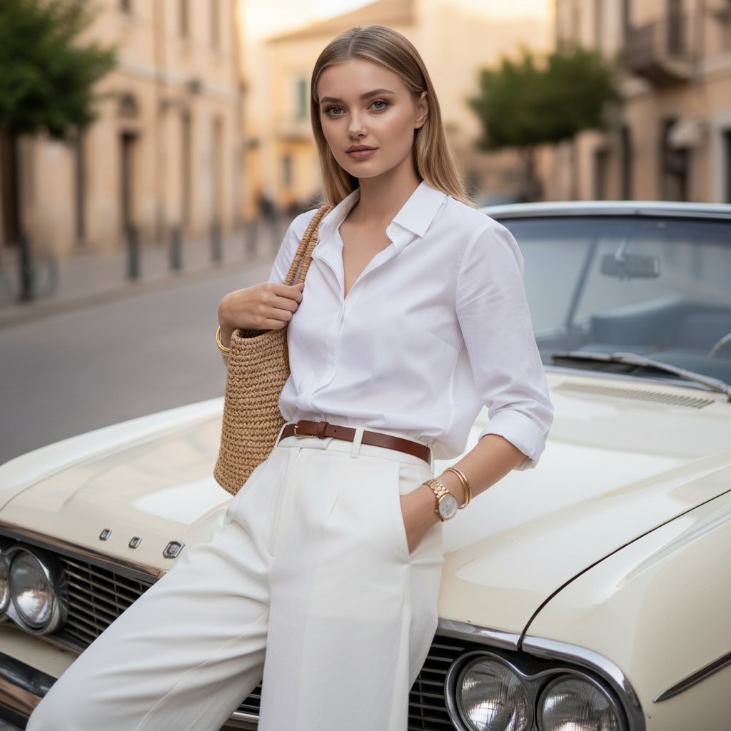 Портрет женщины, прислонившейся к винтажному автомобилю. На ней белоснежная рубашка на пуговицах с длинными рукавами и брюки-кюлоты белого цвета, подчеркнутые коричневым кожаным поясом. Через плечо перекинута сумка с плетеной ручкой. Запястья украшены золотыми браслетами и часами. Крупный план.