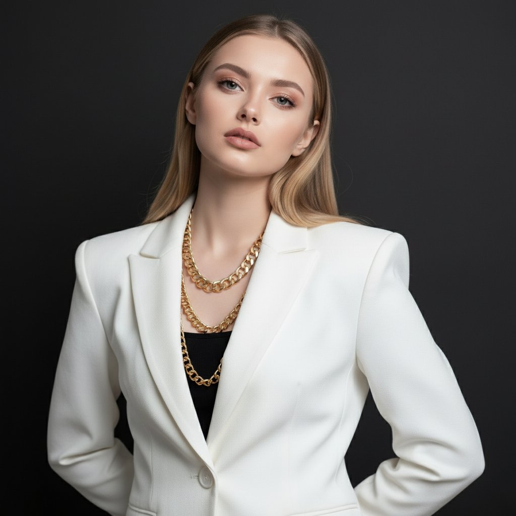 Женщина в эффектном белом жакете с выраженными плечами, украшенном золотой цепью, поверх которого надет черный топ. Голова слегка наклонена к плечу, руки заведены за спину, взгляд направлен в объектив. Фон – гладкая, темная стена.