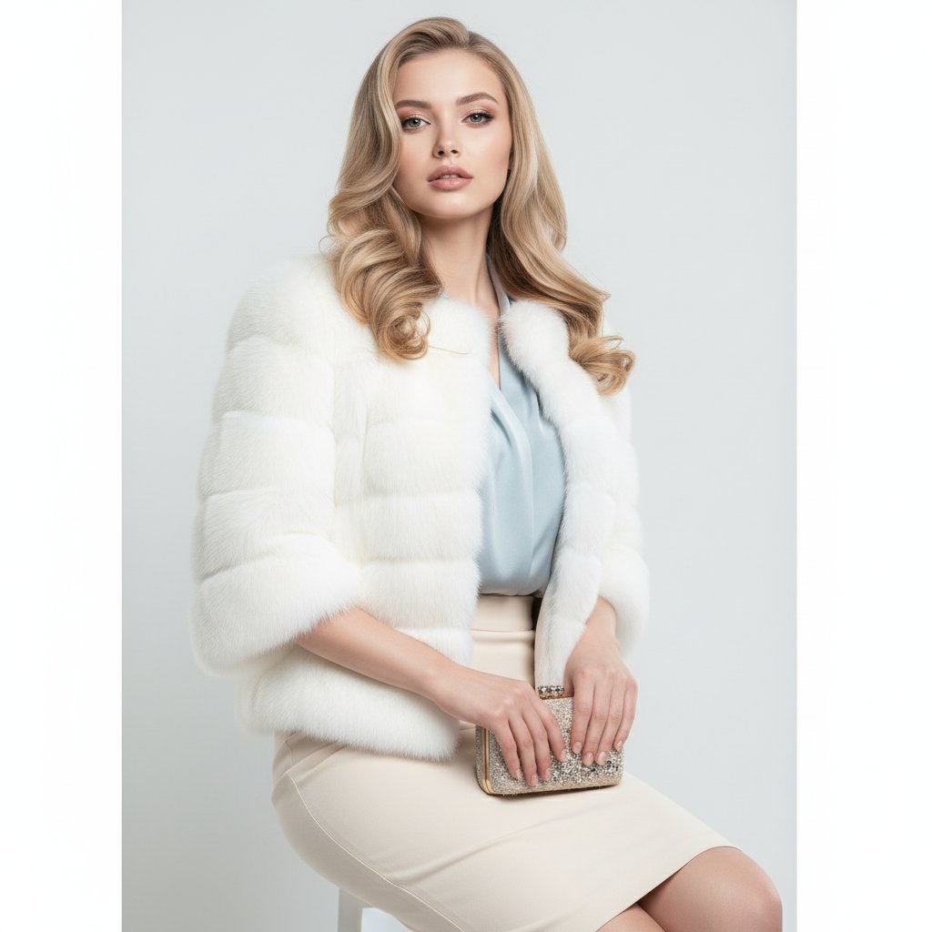 Фотосессия в студии: женщина в белоснежной шубе с укороченным рукавом, под ней — нежно-голубая шелковая блуза и юбка-карандаш кремового оттенка до колена. Расслабленная поза, прямой взгляд в объектив. Гламурный макияж, локоны свободно ниспадают. В изящных руках — миниатюрный клатч. Фон — чистый белый.