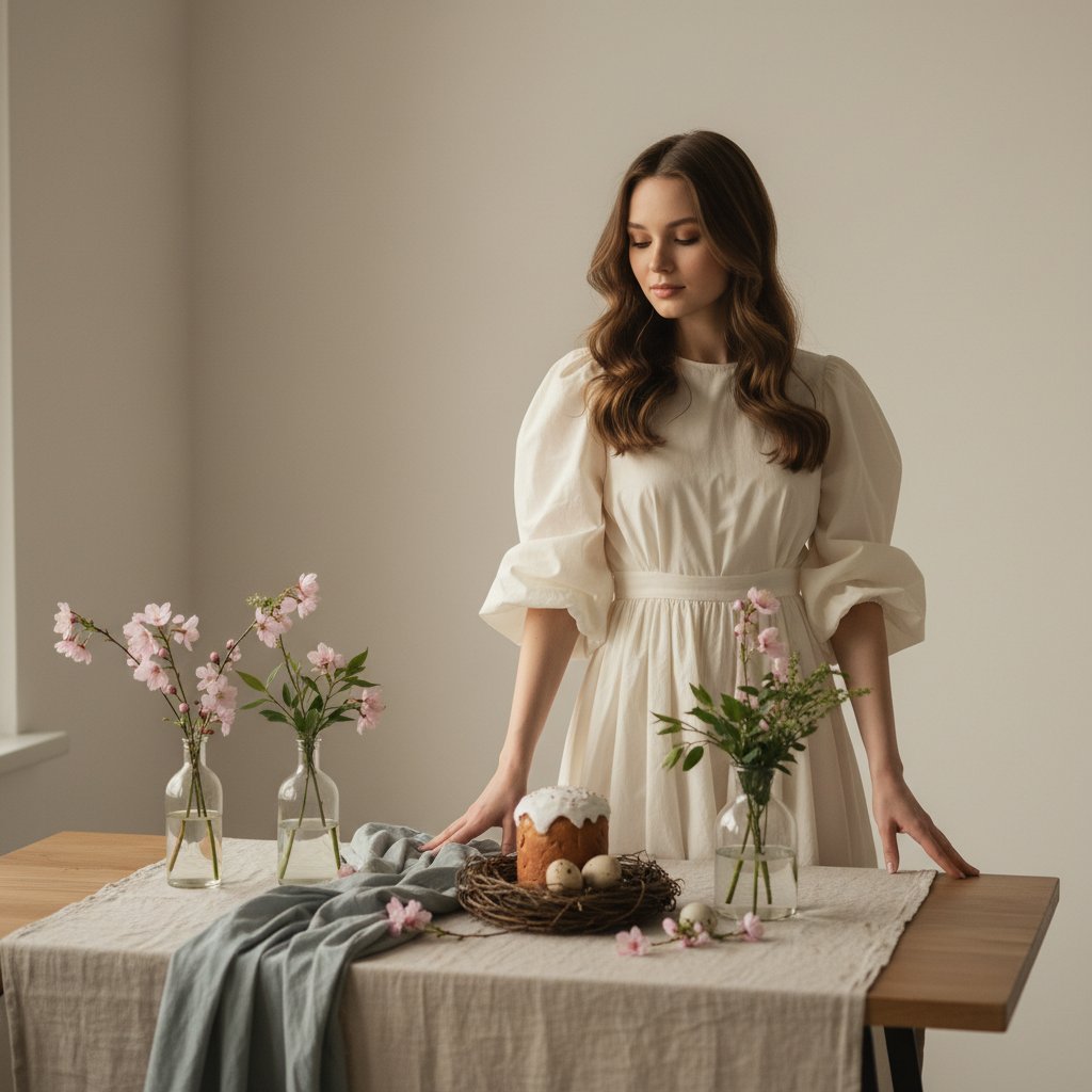 Создай атмосферный пасхальный портрет молодой женщины в минималистичном светлом интерьере. Девушка с длинными мягкими волнистыми каштановыми волосами стоит у стола в воздушном кремово-белом платье с объемными рукавами и поясом. Она смотрит вниз с нежным спокойным выражением лица. На столе — пасхальный кулич с белой глазурью, гнездо с натуральными яйцами, стеклянные вазы с нежными розовыми цветами и веточками, мягкая голубовато-серая ткань, светлая текстурная скатерть. Атмосфера утонченная, спокойная, эстетичная, весенняя и немного fine art. Мягкий естественный свет, минимализм, гармоничная композиция, editorial photography, photorealistic, highly detailed, soft shadows, warm neutral tones, 4k.
