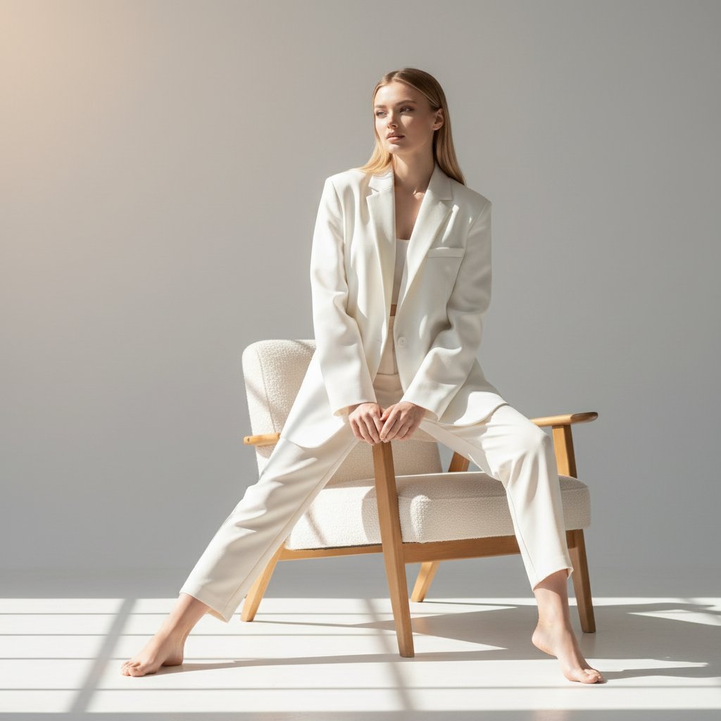 Девушка в свободном белом жакете и брюках цвета слоновой кости сидит вполоборота на подлокотнике светлого кресла. Одна нога согнута, упираясь в сиденье, руки расслабленно покоятся на бедре. Солнечные блики играют на полу и стене. Минималистичный интерьер фотостудии, легкий естественный макияж.