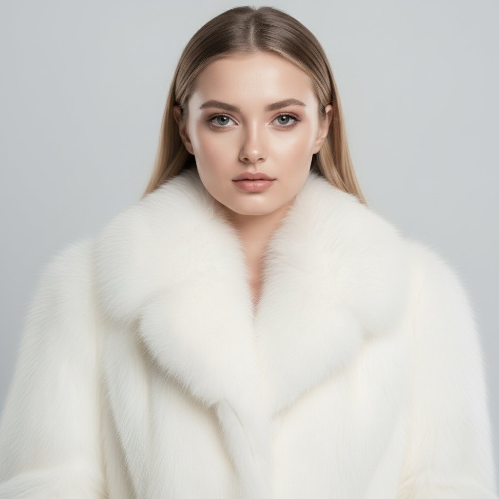 Фотосессия в студии: модель в центре кадра, одетая в белоснежную шубу с объемным меховым воротником. Ее взгляд направлен прямо в объектив, волосы свободно ниспадают, а макияж подчеркивает естественную красоту. Стиль вдохновлен классическими журналами о моде.