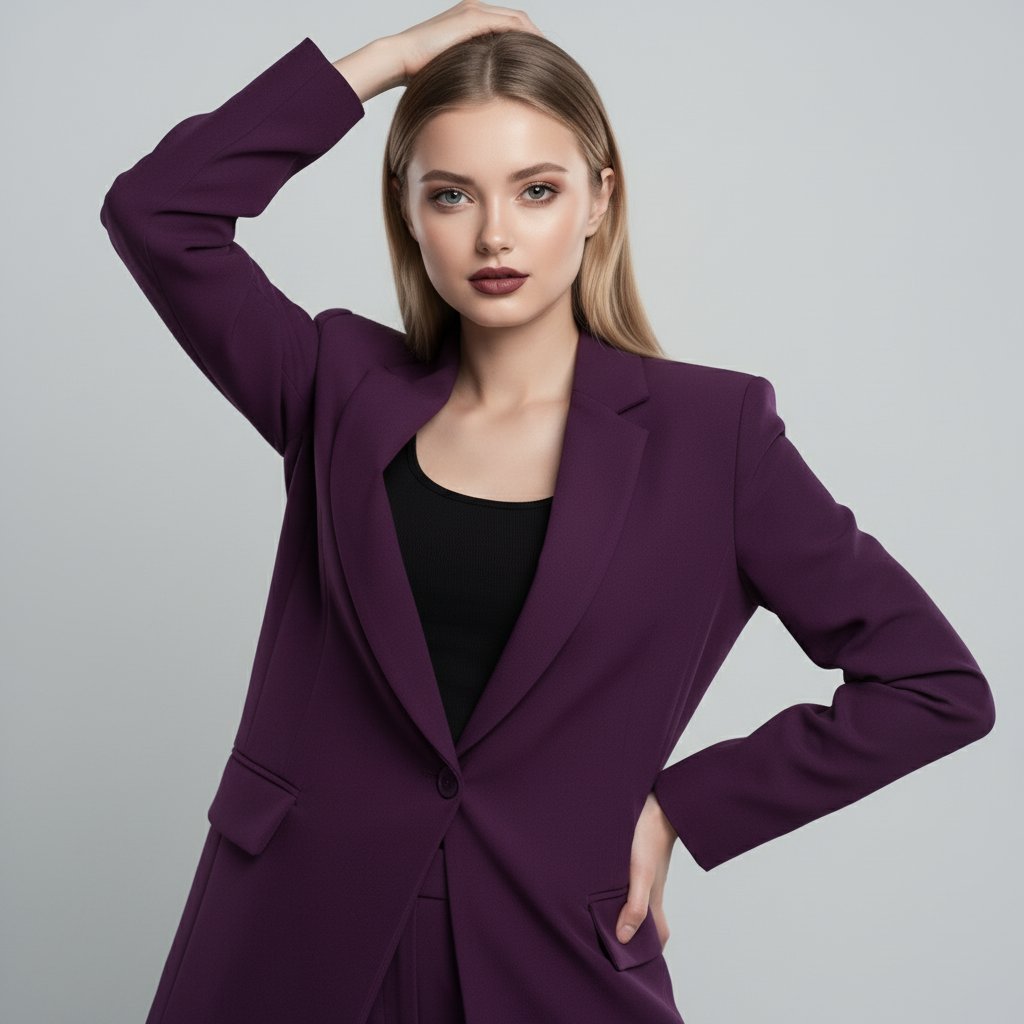 Женский портрет в стильном костюме насыщенного баклажанового цвета. Жакет удлиненного асимметричного фасона с одной застежкой, под ним — простая черная майка. Поза: одна рука на голове, другая у бедра. Взгляд направлен прямо в объектив. Фон нейтральный, светлый.