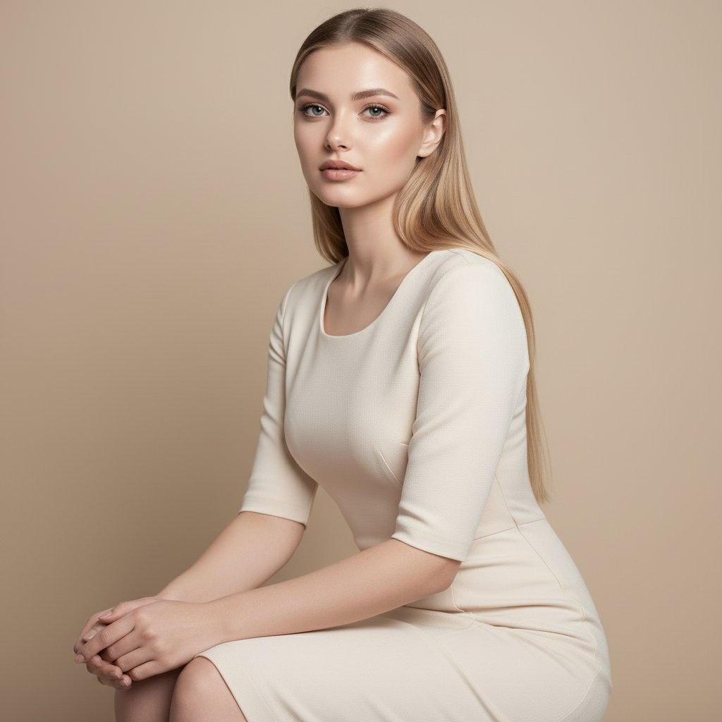 Женщина в элегантном кремовом платье-футляре, сидящая вполоборота, с руками, спокойно покоящимися на коленях. Она смотрит прямо в камеру. Макияж глаз выполнен в стиле 'smoky eyes' с легкими стрелками, губы с натуральным блеском, кожа безупречно гладкая и сияющая. Фон — гладкая бежевая стена, создающая монохромную гармонию с нарядом и образом. Средний план.