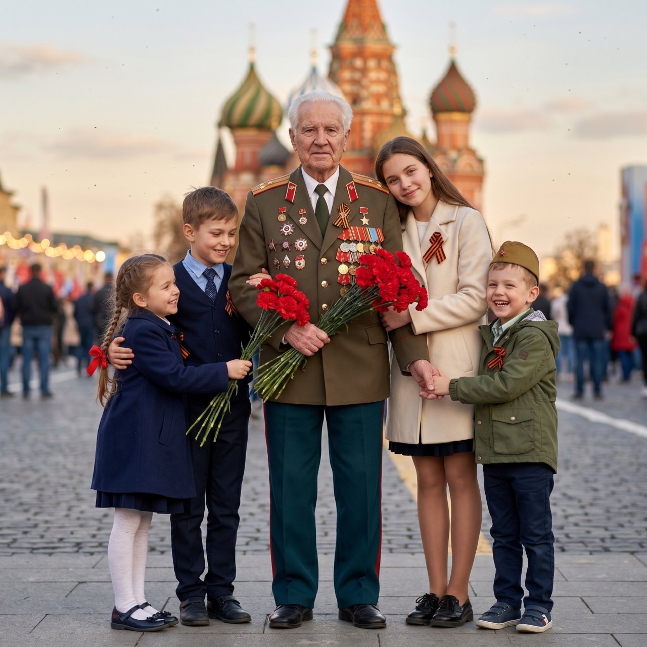 NanoBanana ProИспользуй лица загруженных фотографий как референсные, фотореалистичная семейная сцена ко Дню Победы, пожилой мужчина-ветеран в парадной советской военной форме стоит в центре композиции, серьёзный, но тёплый взгляд, седые волосы, на груди множество орденов и медалей, в руках большой букет ярко-красных гвоздик, вокруг него четверо детей разного возраста — две девочки и два мальчика — обнимают ветерана и держатся за цветы, искренние улыбки, атмосфера уважения, памяти и семейной преемственности поколений, фон — Красная площадь с мягко размытым силуэтом храма Василия Блаженного, тёплый вечерний свет, лёгкое золотистое свечение и мягкие световые частицы в воздухе, естественные пастельные цвета, высокая детализация лиц, ткани и наград, кинематографичная глубина резкости, реалистичные текстуры кожи и одежды, вертикальная композиция, полный рост, профессиональная праздничная фотография, трогательная эмоциональная атмосфера, ультрадетализированный фотореализм, качество 8K, мягкое боке на фоне, гармоничная композиция с акцентом на связь поколений и память о Победе.